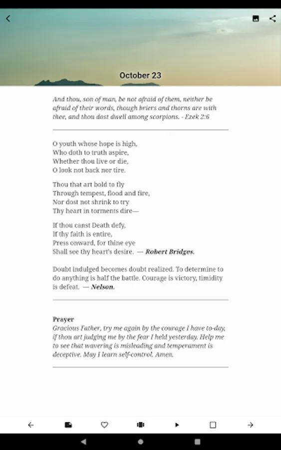 Daily Prayer is a daily devotional and prayer guide based on Leaves of Life; a compilation of bible verses, prayer, poems, and quotations from famous authors, writers and poets including Ralph Waldo Emerson, John Ruskin, Robert Browning, William Shakespeare, Alfred Tennyson, Goethe, James Russell Lowell, Henry W. Longfellow, Thomas Carlyle, Arthur C. Benson and others compiled by Margaret Bird Steinmetz.