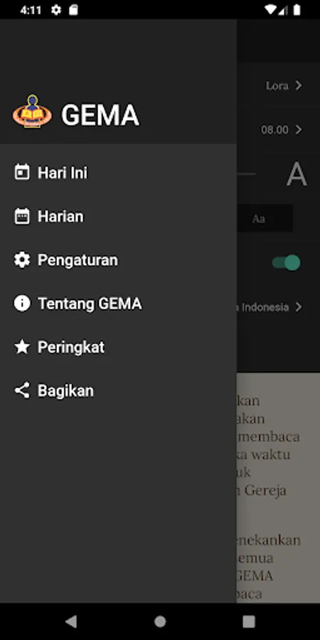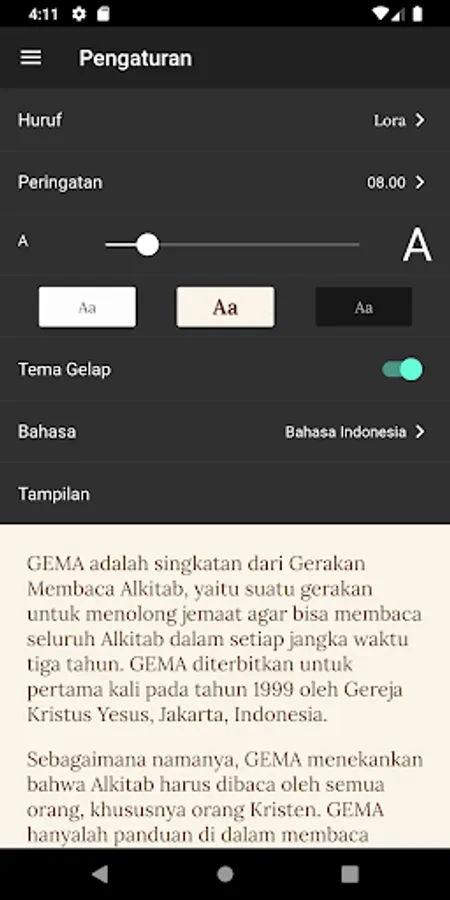 As the name implies, GEMA emphasize that the Bible should be read by everyone, especially Christians. GEMA just guidelines, in reading the Bible so that Bible readers can regularly read the Bible and understand the Bible. The Bible is the word of God that must be read and ponder so that we can know God and his heart's content and get to know Jesus Christ, Savior and Lord, so that we have eternal life and can live according to God's plan.