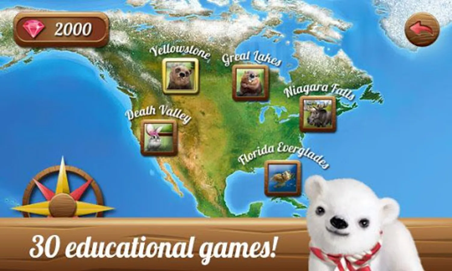 Plunge into this incredible adventure where you can visit the continents and have fun with its 30 games. You can also win and collect more than 50 stickers with information about all the animals. Each time you complete a game you will lower the Earth’s temperature and help the Polar Bear.