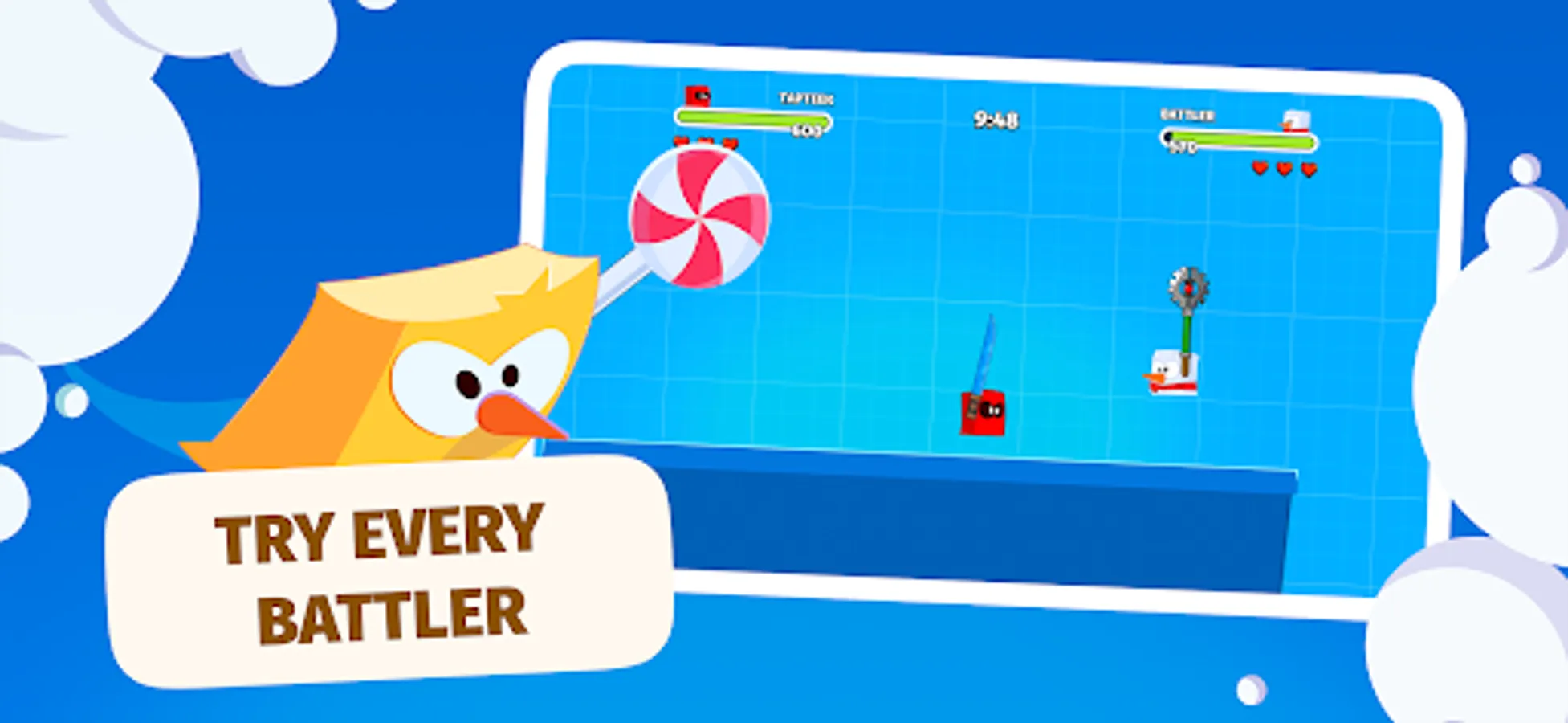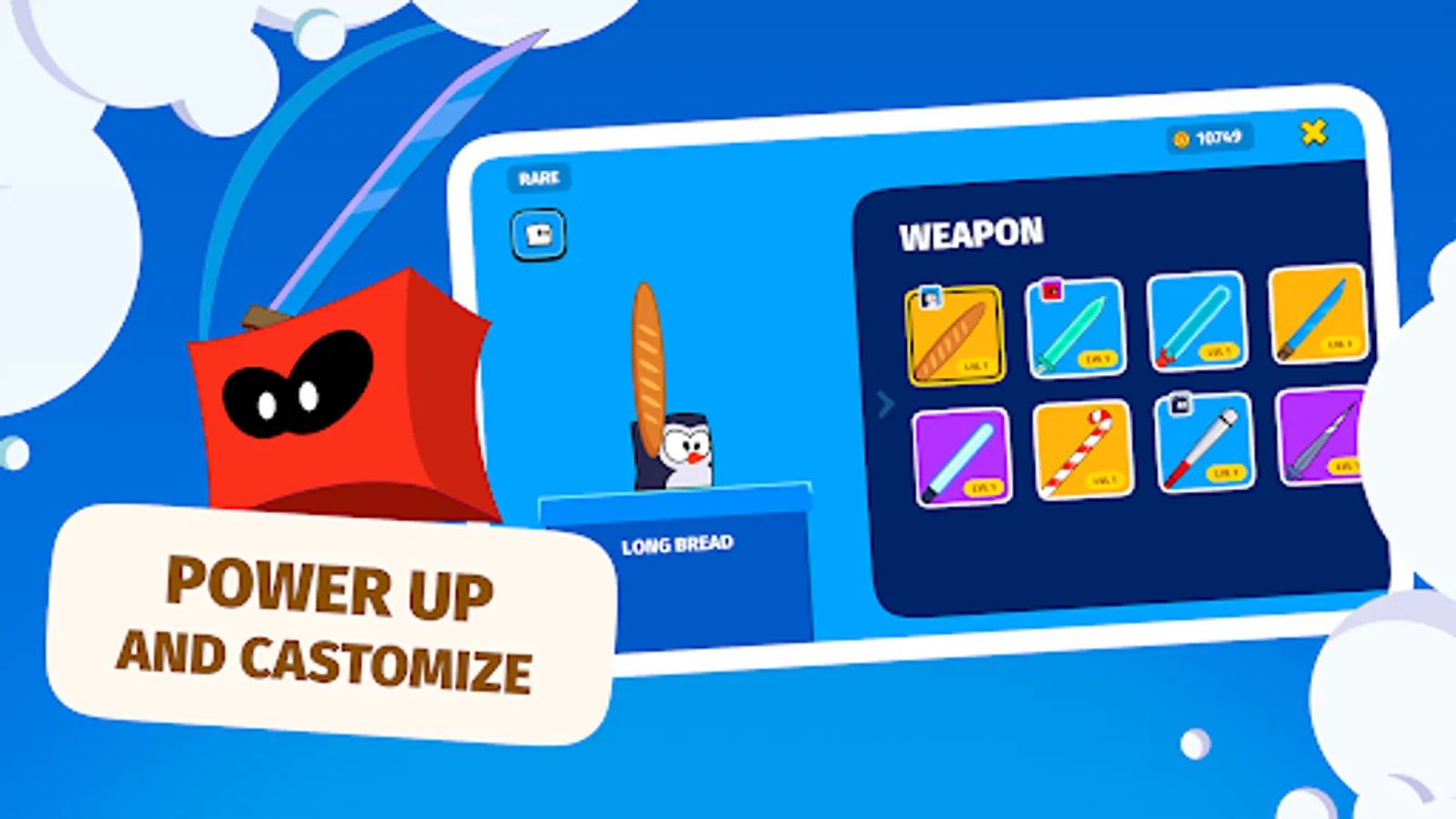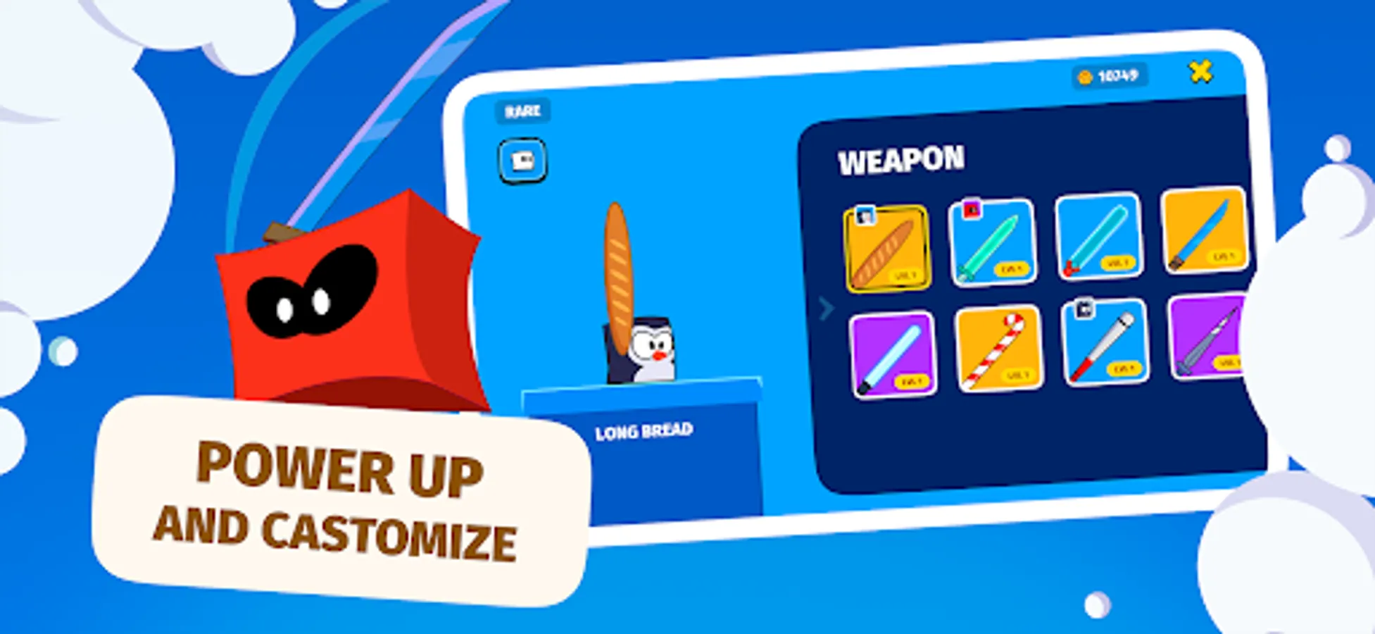 Uncover dozens of fun and crazy weapons, from swords and axes to bread and lollipops, that will complement your fighter's character. Improve and surprise your opponents with your abilities.