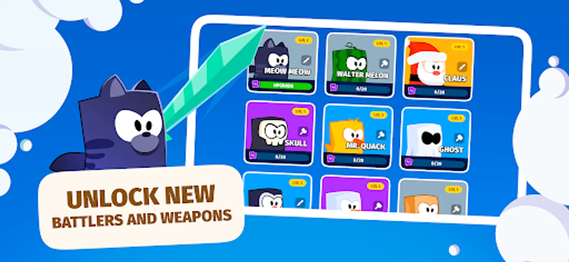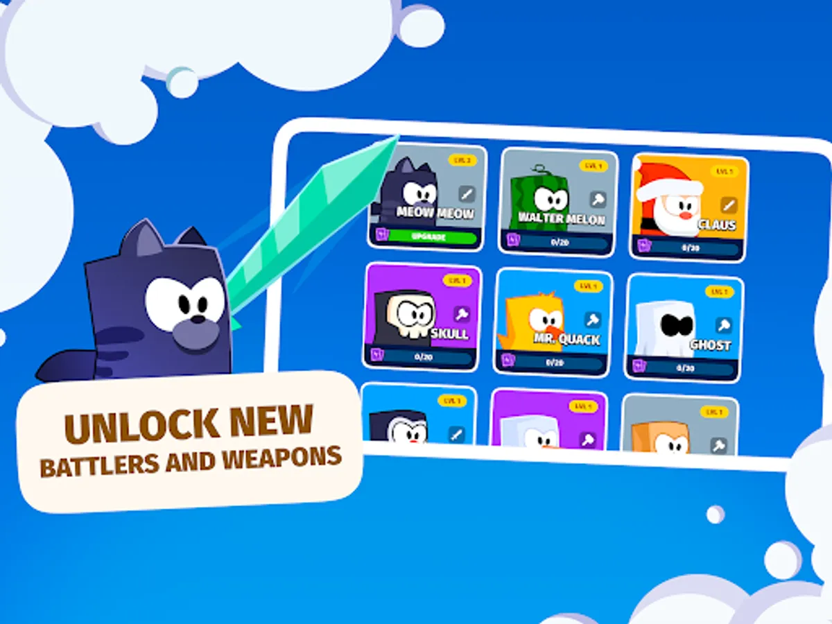 Get daily rewards in battles: open new characters and weapons, learn new skills, get upgrade cards, and unlock new game modes.