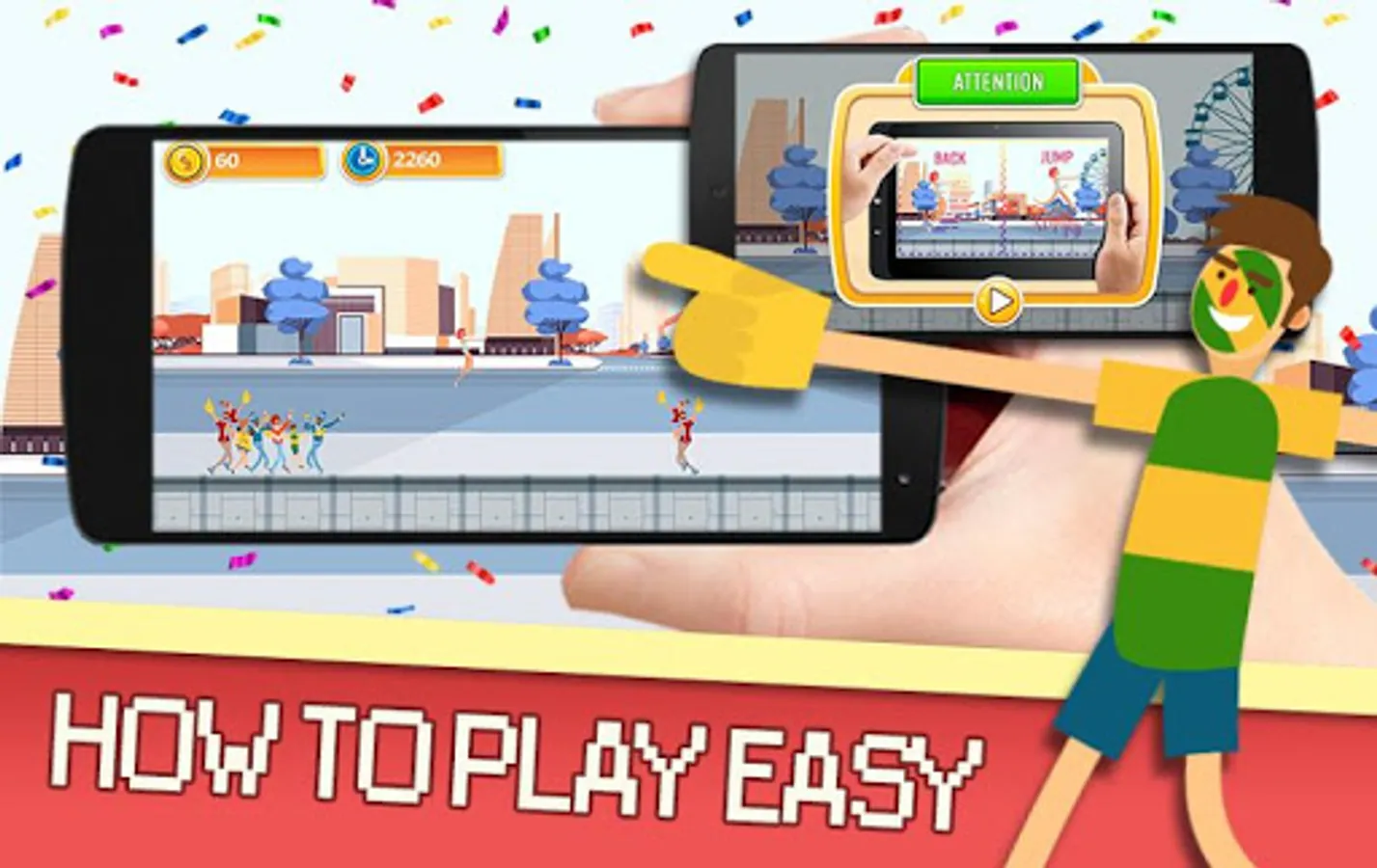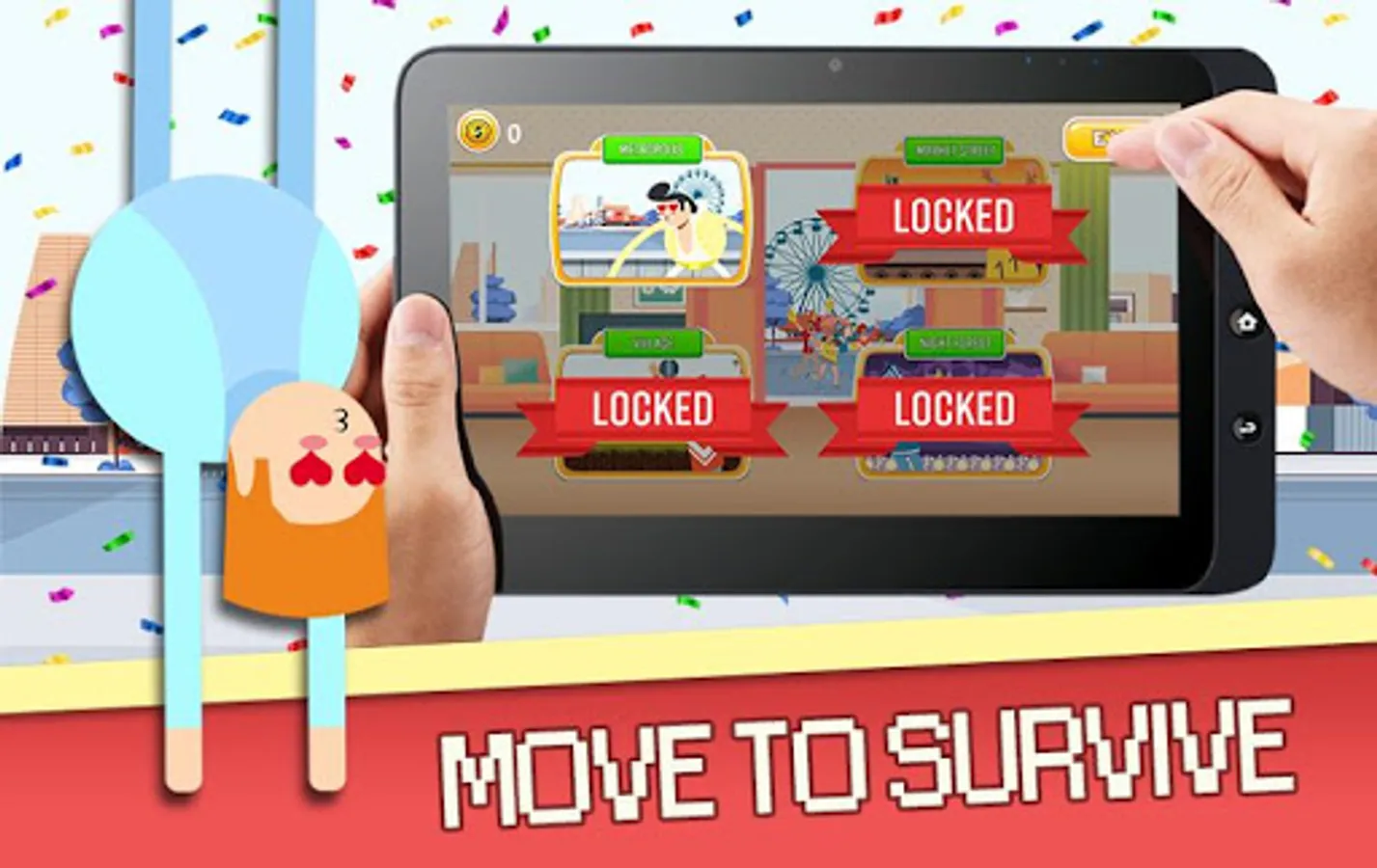 Run away from crazy fans chasing safe areas in the vast metropolis location, in a very crowded street market location, in a very quiet rural location and in a very lonely and dark forest.