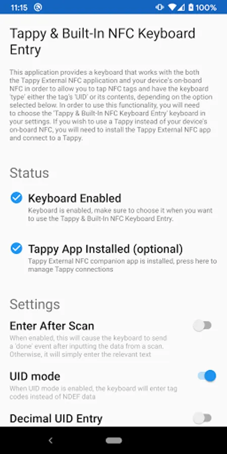 The Tappy & Built-In NFC Keyboard Entry works with both the Android built in NFC reader and an external Tappy NFC reader (USB or BLE). When using the external Tappy NFC readers, the Tappy External NFC app is required.