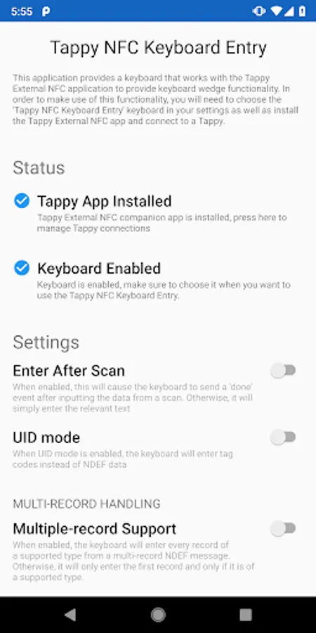 The TappyNFC Keyboard Entry works with with external Tappy NFC reader (USB or BLE). This app requires the companion app called "Tappy External NFC" to manage the connection to the external reader.