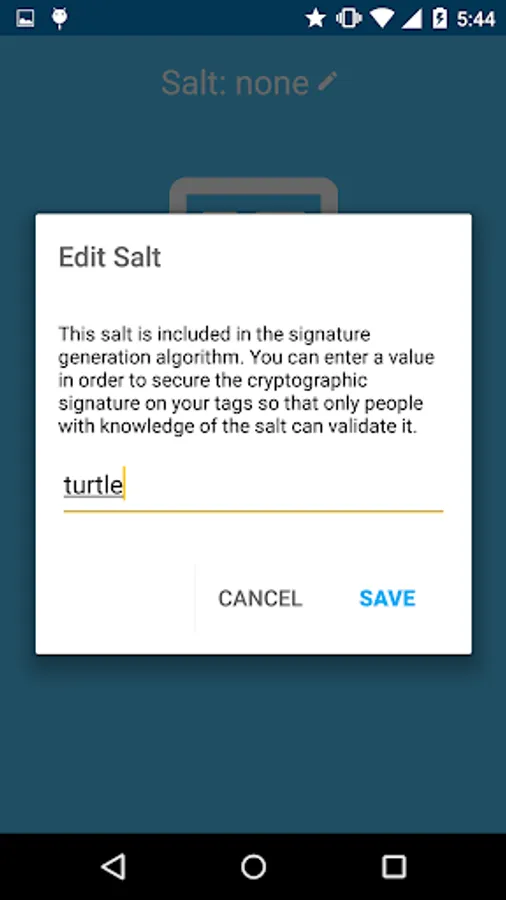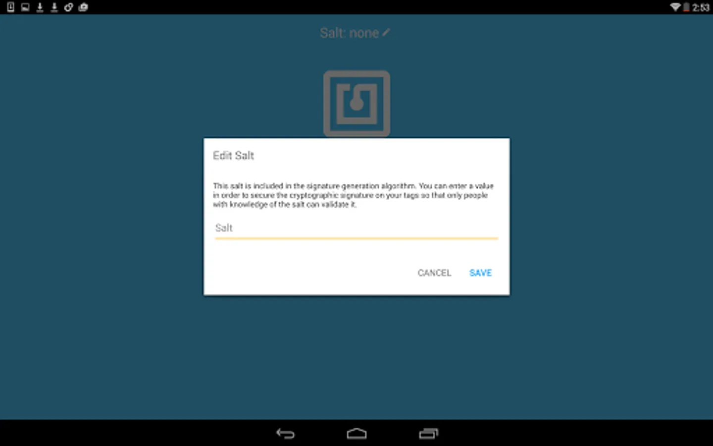 TapTrack's TrustTap system uses a cryptographic signature to allow for verification of the identity of an NFC tag beyond just its UID (serial number). This free evaluation version signs and verifies NFC tags using a signature derived from a user-specified salt. This ensures your tags are unique and differ from those of other users of this evaluation app.