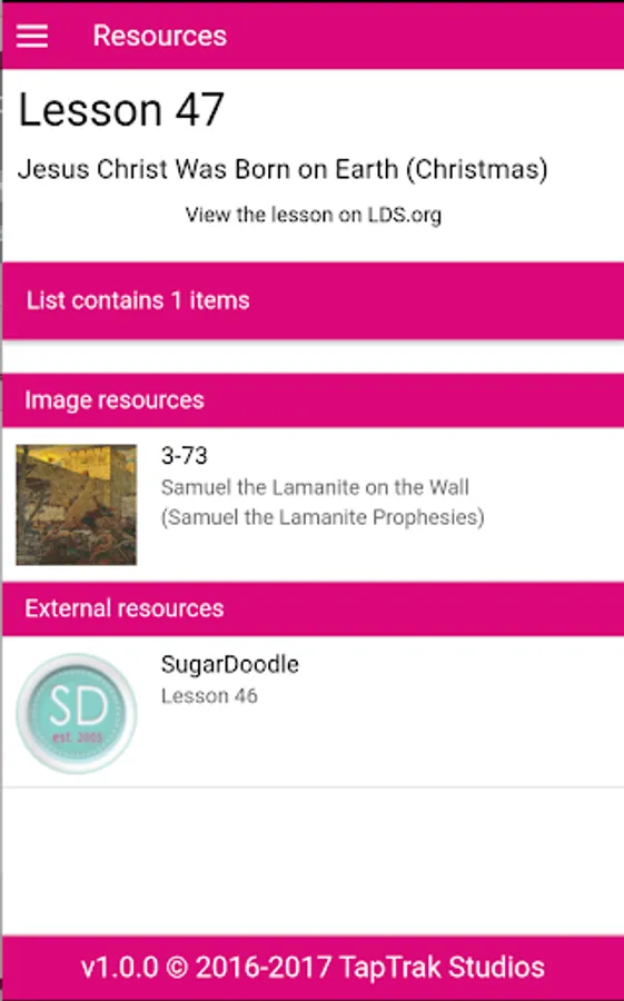 Lessons: The Lessons show a link to the lesson on LDS.org, all the resources available for the lesson including title and thumbnail, and the external resources for the lesson. To view a specific resource details just tap the item in the list.