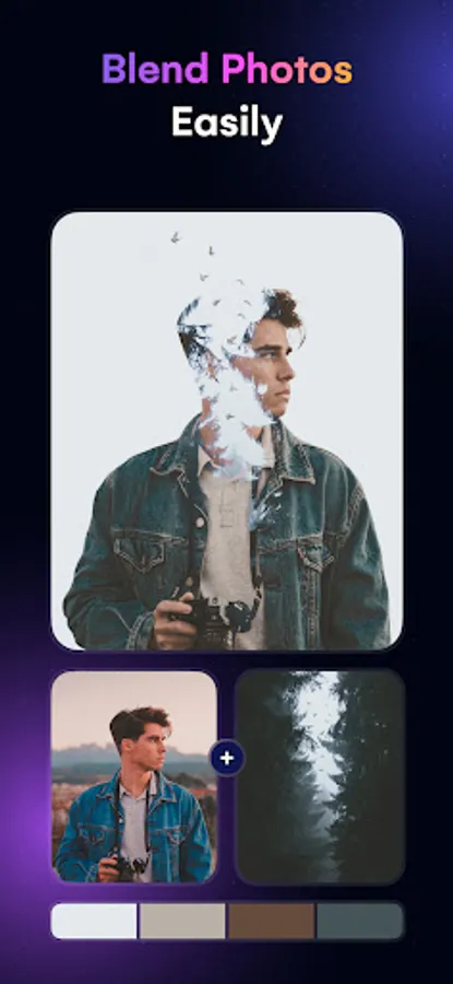 Discover the power of picture overlay and unleash your artistic touch with Blend Photos. It offers a range of photo blender features at your fingertips - from basics like cropping and rotating to more complex tools like creating double exposure or photo mixer and picture overlay. With the selection of highly customizable photo blender effects, you can craft blend photos that look proffesional and polished in a few seconds.