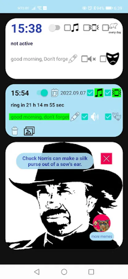 Alarm clock with voice reminders and always new jokes about Chuck Norris for reliable awakening and good mood for the whole day. Set an alarm for every day or on a specific date. Wake up to your favorite ringtone, with or without voice reminders. Add a fresh voice joke about Chuck Norris to the signal in one click. Create new memes and share them easily in a couple of clicks. Make fun of your friends. Simulate a phone call at work if you are on a bad date. Confess your love to your partner when he is not expecting it. And there are many more ways to apply Chuck's Alarm Clock.