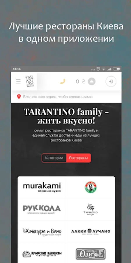 Cemya restaurants TARANTINO family and single food delivery service of the best restaurants in Kiev: Murakami, Arugula, Papa John's, Tarantino, khachapuri and Wine, Lakki Luchano, Crimean Vacations, Olivier, Cherry, Syndicate.