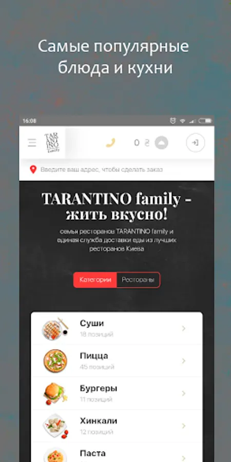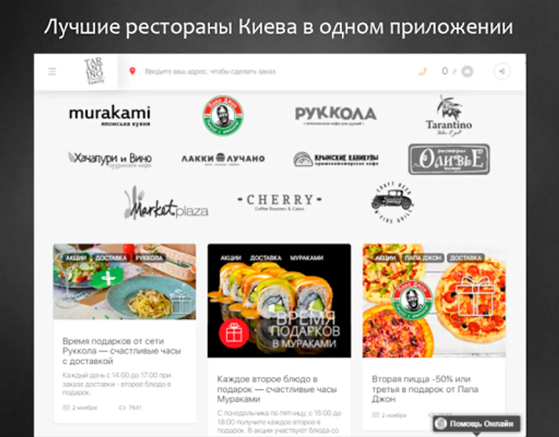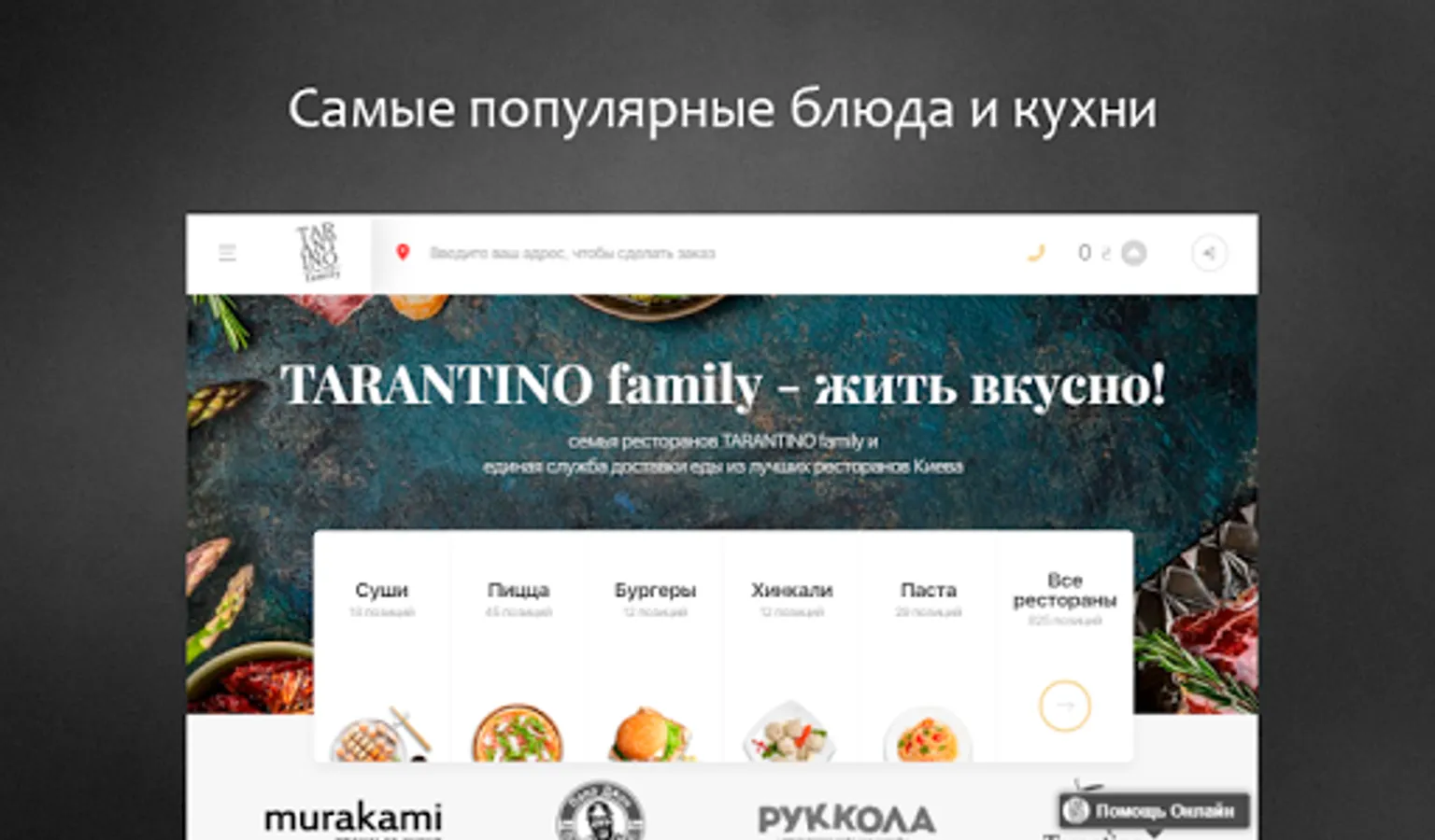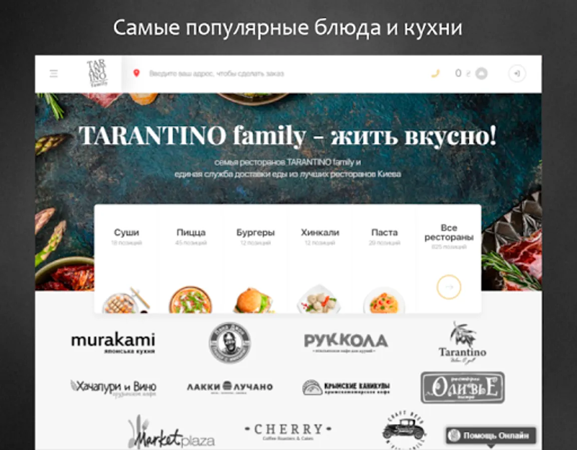 Service TARANTINO family - a simple and convenient way to order fast food in Kiev. Sushi, pizza, burgers, pasta, khinkali - the most popular dishes, specialties and brands assembled in one website and place an online delivery order you can in a few clicks, as well as receive a bonus for every order, track order status in real time, save favorite dishes in a private office, and many other features.