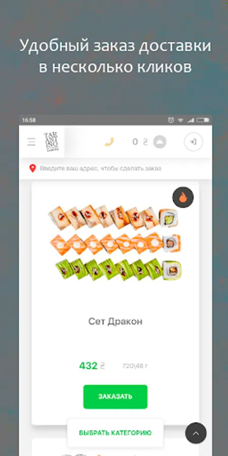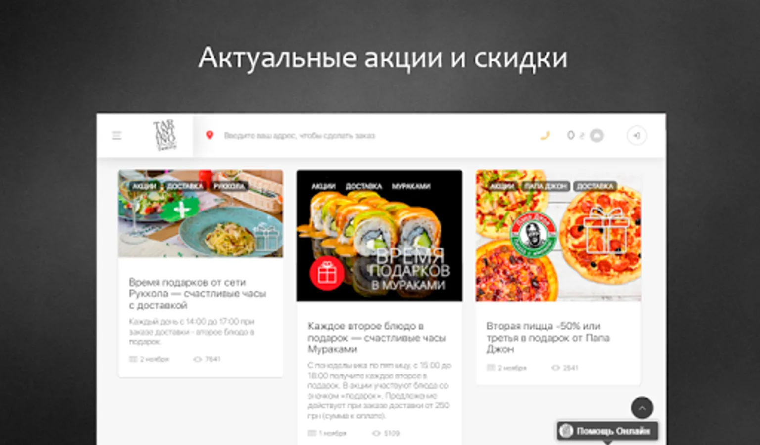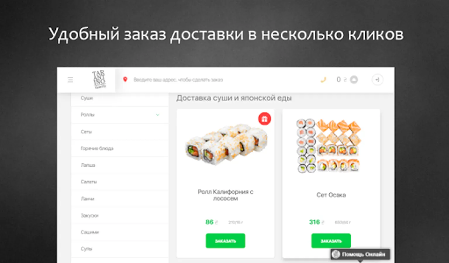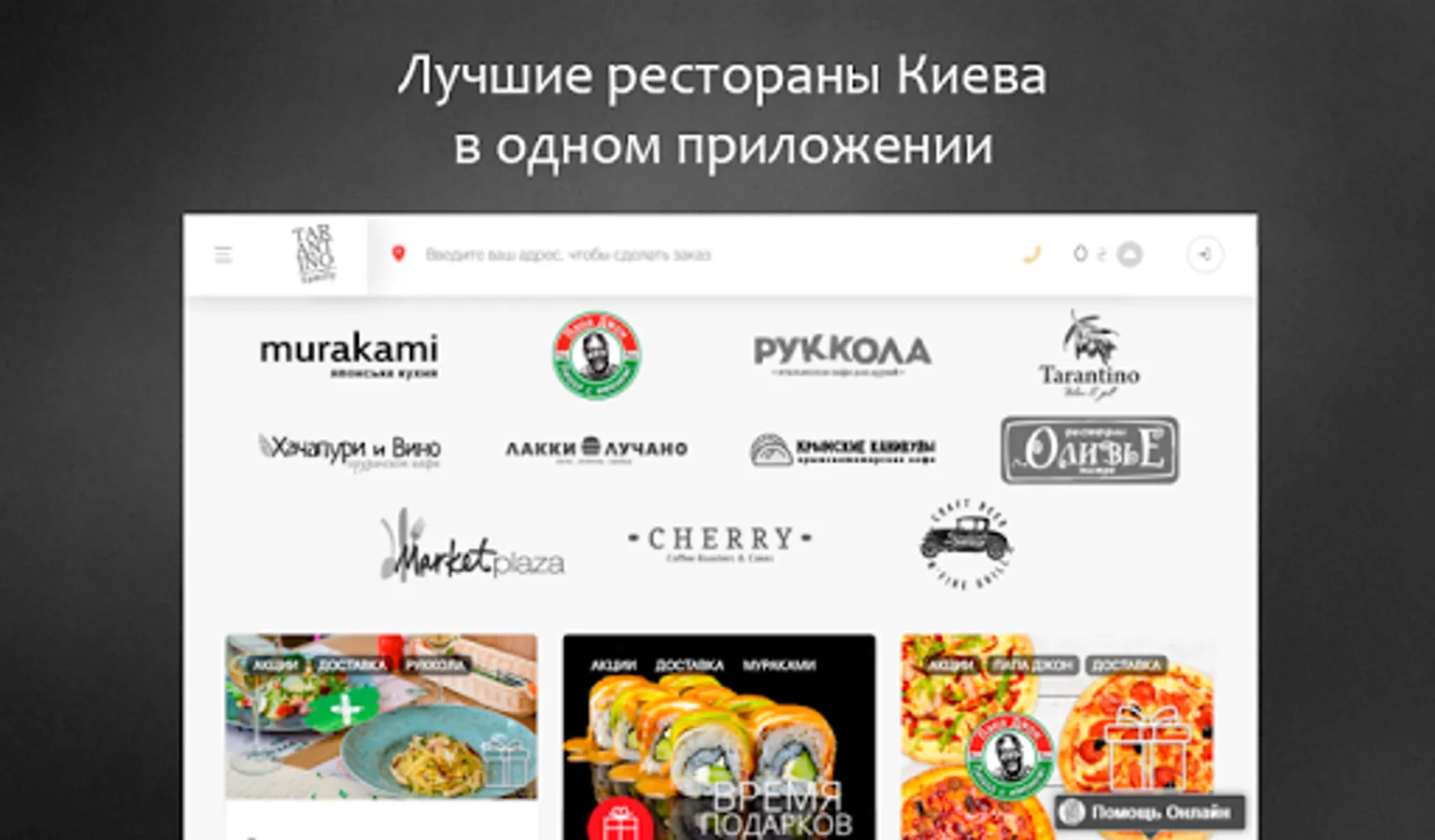 Service TARANTINO family - a simple and convenient way to order fast food in Kiev. Sushi, pizza, burgers, pasta, khinkali - the most popular dishes, specialties and brands assembled in one website and place an online delivery order you can in a few clicks, as well as receive a bonus for every order, track order status in real time, save favorite dishes in a private office, and many other features.