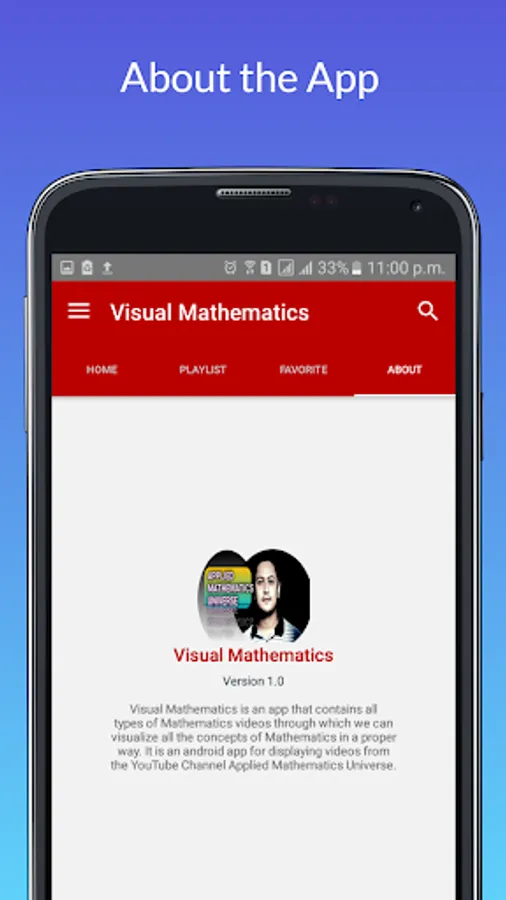 Visual Mathematics is an app that contains all types of Mathematics Video through which we can visualize all the concepts of Mathematics in a proper way. It is an android app for displaying Videos from the YouTube Channel "Applied Mathematics Universe".