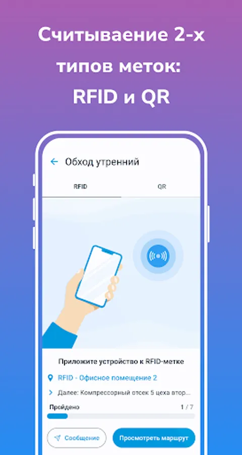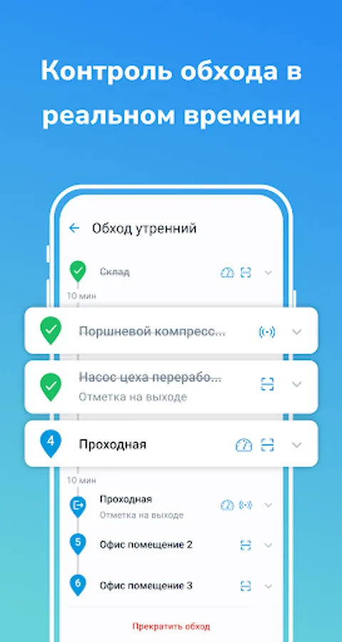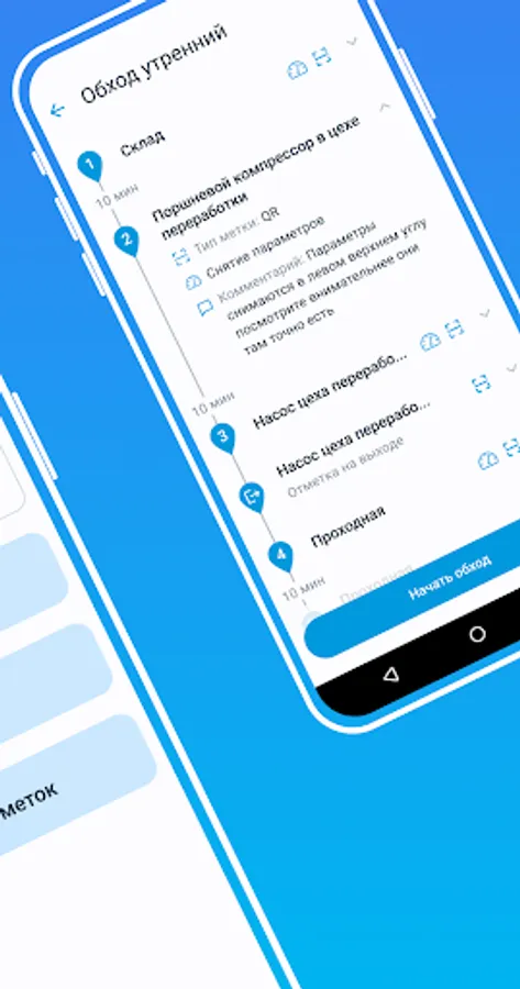 When moving along the route, the employee brings the smartphone to the marks and all information about the event and actions from the object is transmitted to the TARGControl system.