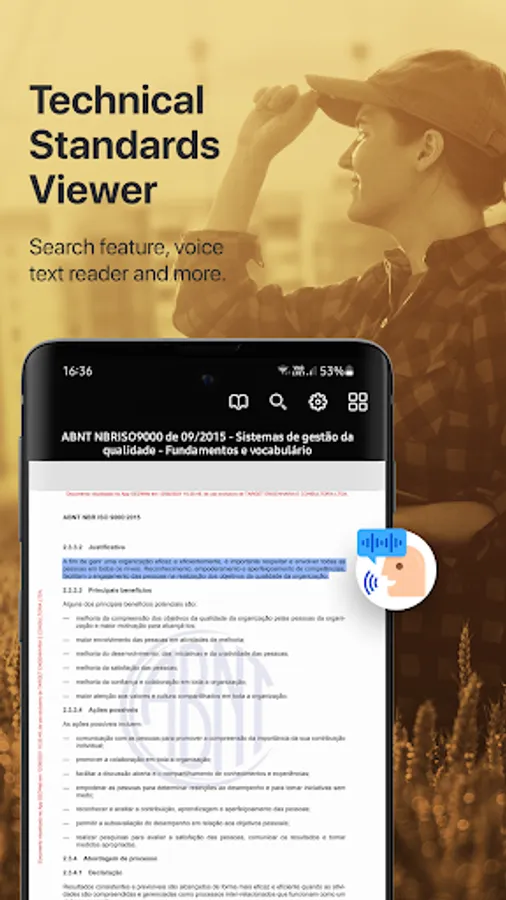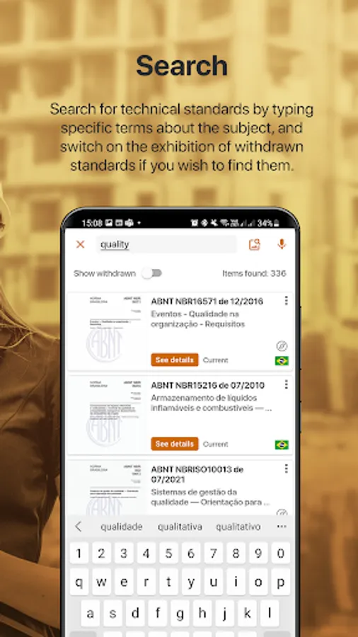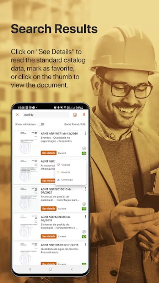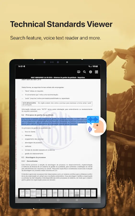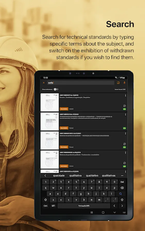 Search in all ABNT NBR and Mercosur standards. Use the text, voice or image search features. That's right! Take a photo and research the standards related to the subject.