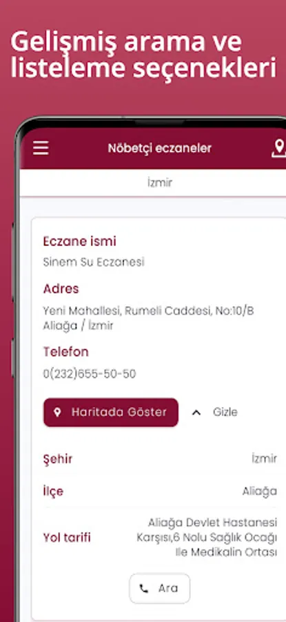 You can reach all the pharmacies on duty by selecting the province and district. If you wish, you can select only the province and request all the pharmacies on duty in that province. Moreover, you can easily view the pharmacies on duty near you.