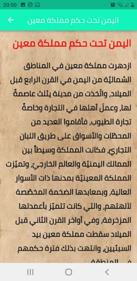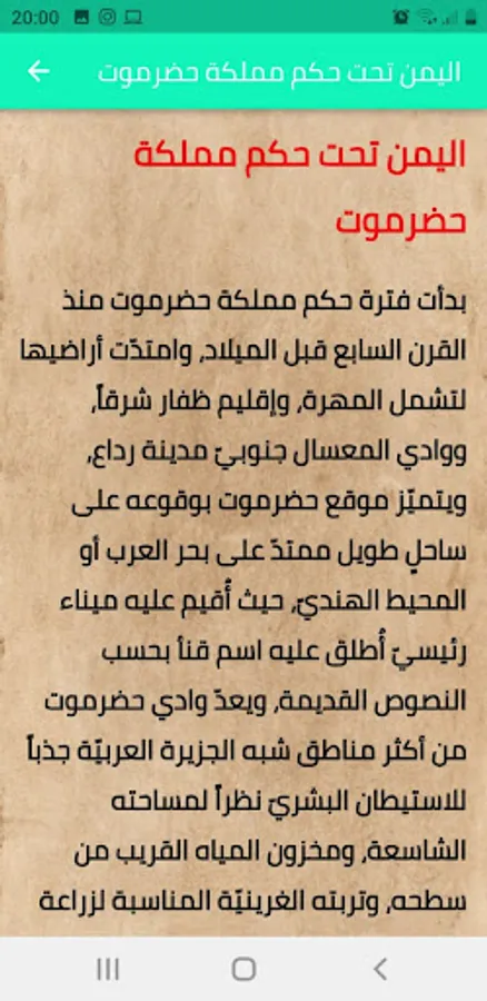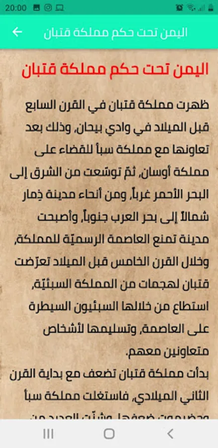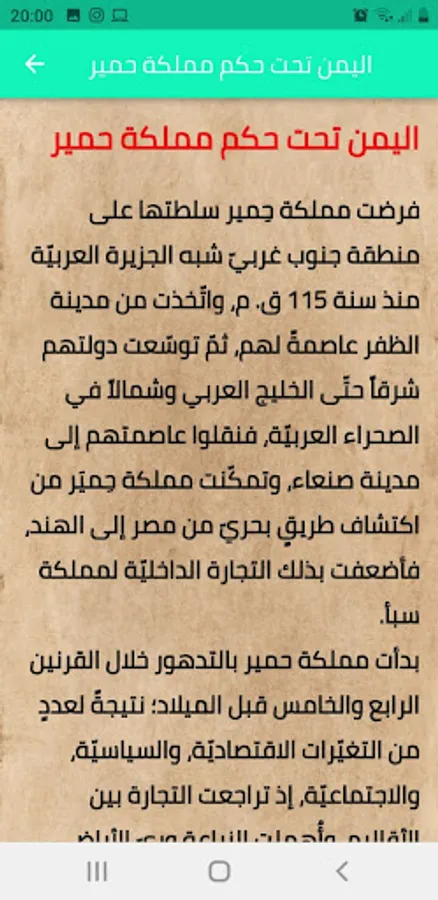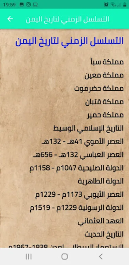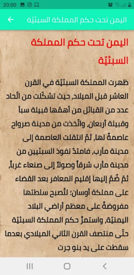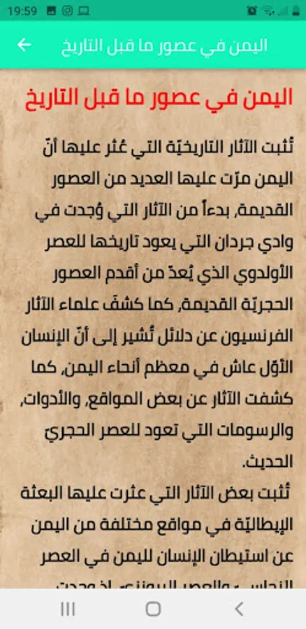 The Yemen History application is designed with high quality, easy to operate, and suitable for all phones. It is also small in size and does not take up much space in the phone's memory.
