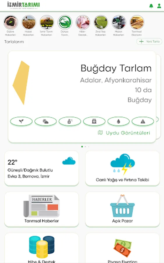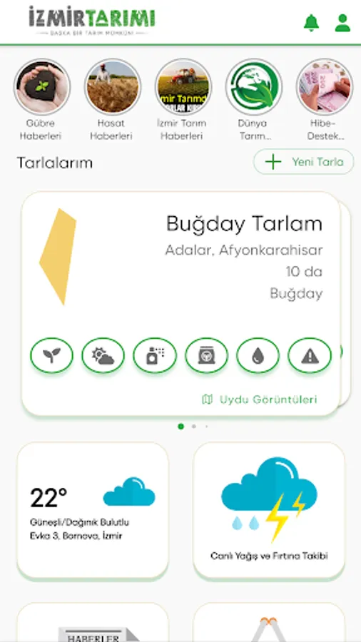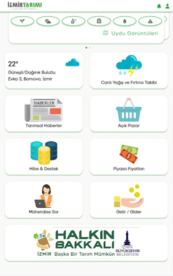 With the mobile application, the producers operating in agriculture throughout Izmir can receive professional agricultural support by analyzing satellite imaging systems with agricultural algorithms, monitor the status of the field remotely, make spraying, fertilization, irrigation and aquaculture decisions with data support, as well as exhibit the products of the producer with the mobile application. and a platform has been created where they can meet with buyers.
