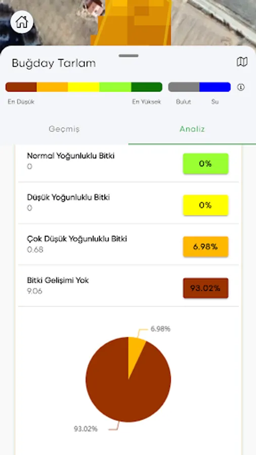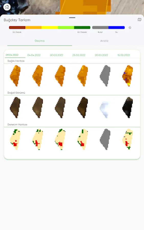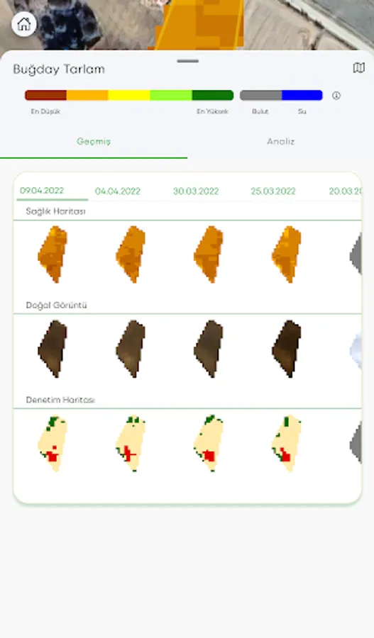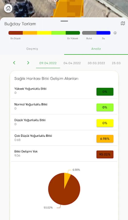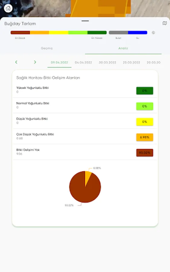 Phytosanitary Monitoring: The phenological development status of the farmer can be analyzed with a date by following the crop in the registered field by using satellite imaging systems and agricultural algorithms. Thus, the development areas of the plants in the field can be seen with colors and percentages, and the problematic points will be followed historically.