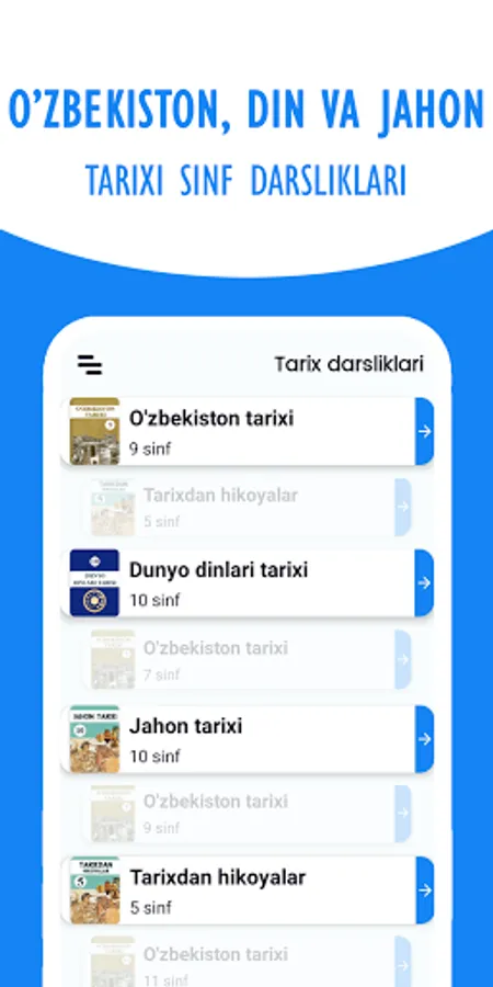 Tarix kitoblari PDF to'plami ko'rinishda - bu sizning doimo yoningizda bo'luvchi, internetsiz offline va bepul ishlovchi, istalgan vaqtda foydalanishingiz uchun 5-sinf dan 11-sinf gacha bo'lgan barchalanov taririliklari jamad