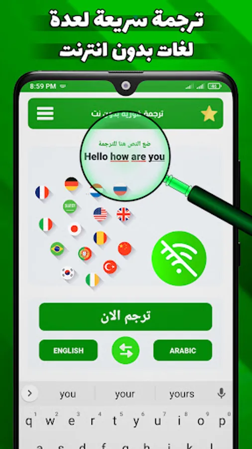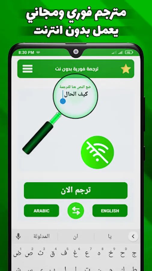 Simultaneous translation without a double net so that it allows translation from Arabic into English and Arabic into French or English into Arabic or Spanish into English or German or translating all languages of the world and vice versa also translation from English into Arabic professionally where words are suggested to you as soon as you write the letter or the first letters of it .