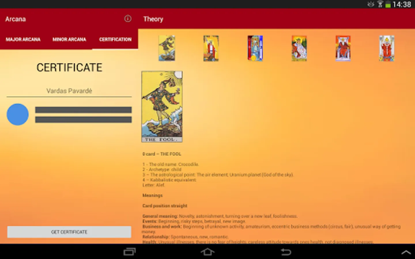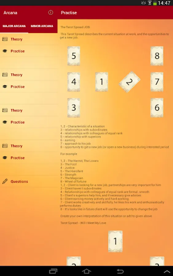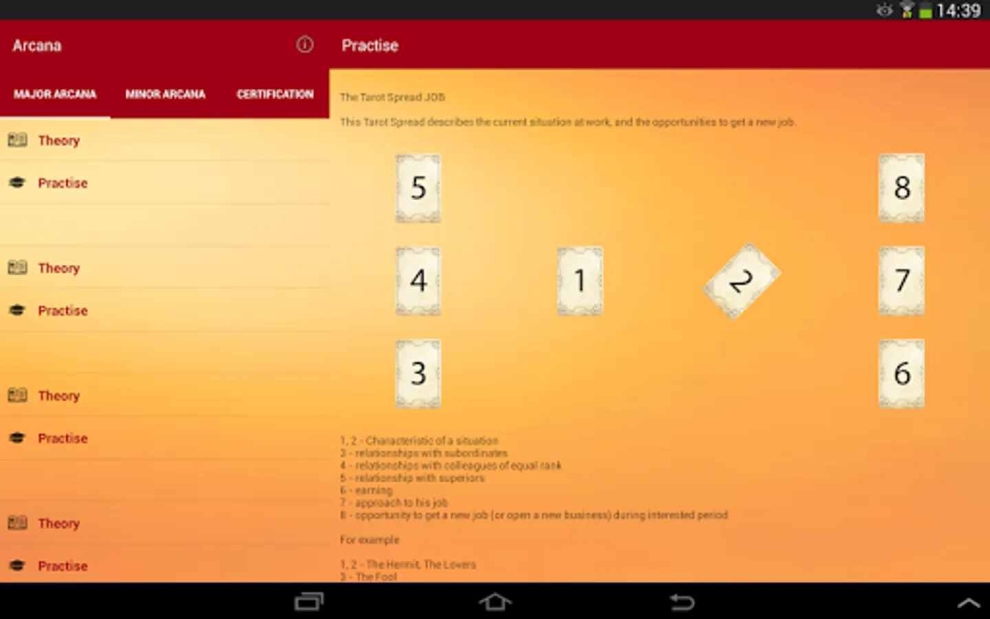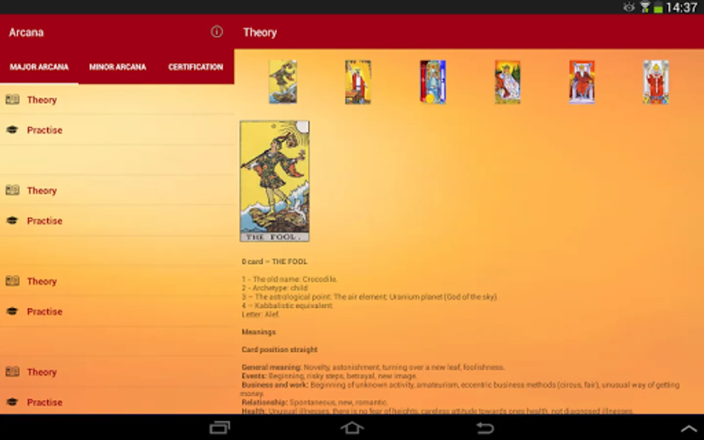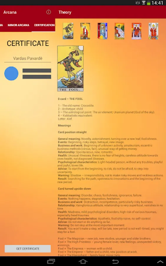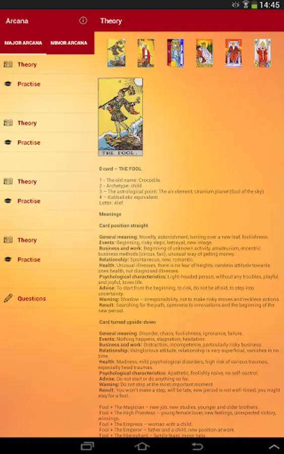 * In practical course you will learn How to Conduct a Tarot Reading, how to find the significator for your client, you will find out about 22 psychological types of your clients and you will use the spreads that are used by the author of the application.