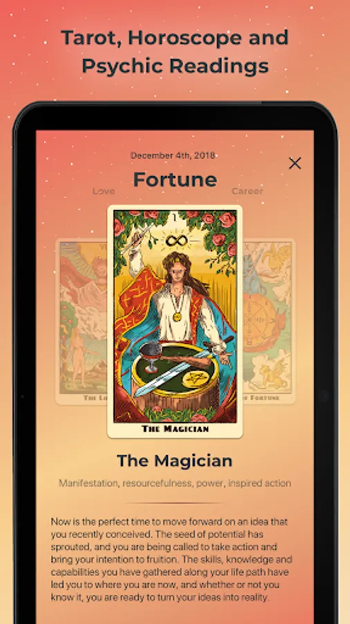 Simply choose your cards in the daily spread and receive instant insight into your situation. Tarot helps you to make better informed decisions, trust your intuition more and live a life aligned with your highest purpose. The easy to understand format and the choice in options for love, career, health and wealth spreads presents you with the best insights.