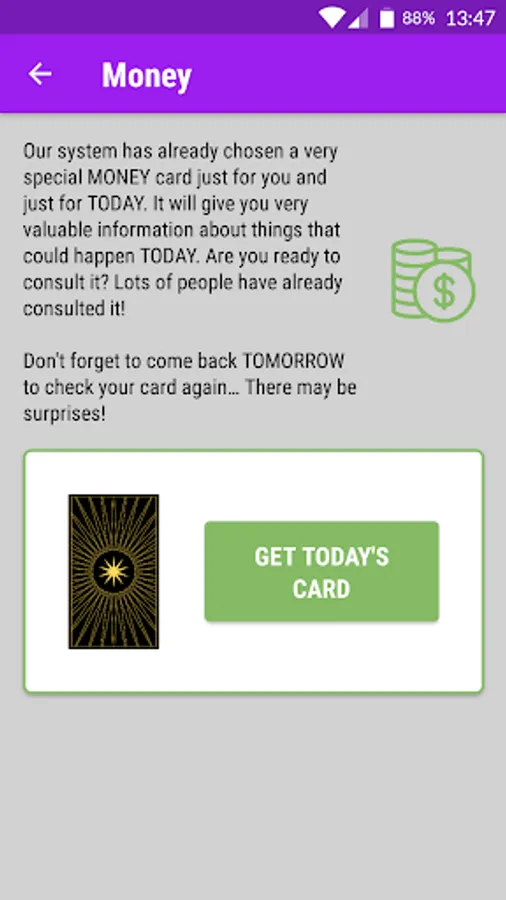 One of the great things about this tarot card meanings app is that it offers a variety of tarot card readings, including love and money. So, suppose you're looking for guidance in your love life. In that case, the love card reading can provide insight into your relationships and help you navigate any challenges or conflicts that may arise.