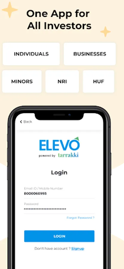Elevo Investment App lets individuals, NRIs, minors, HUFs, and companies (including partnership, proprietorship, limited, LLP, and trust) to invest in mutual funds and make good profits.