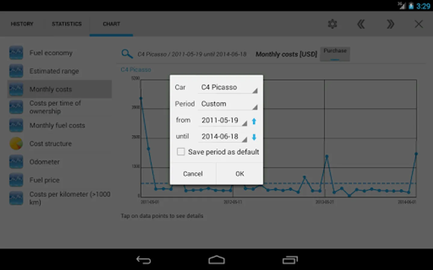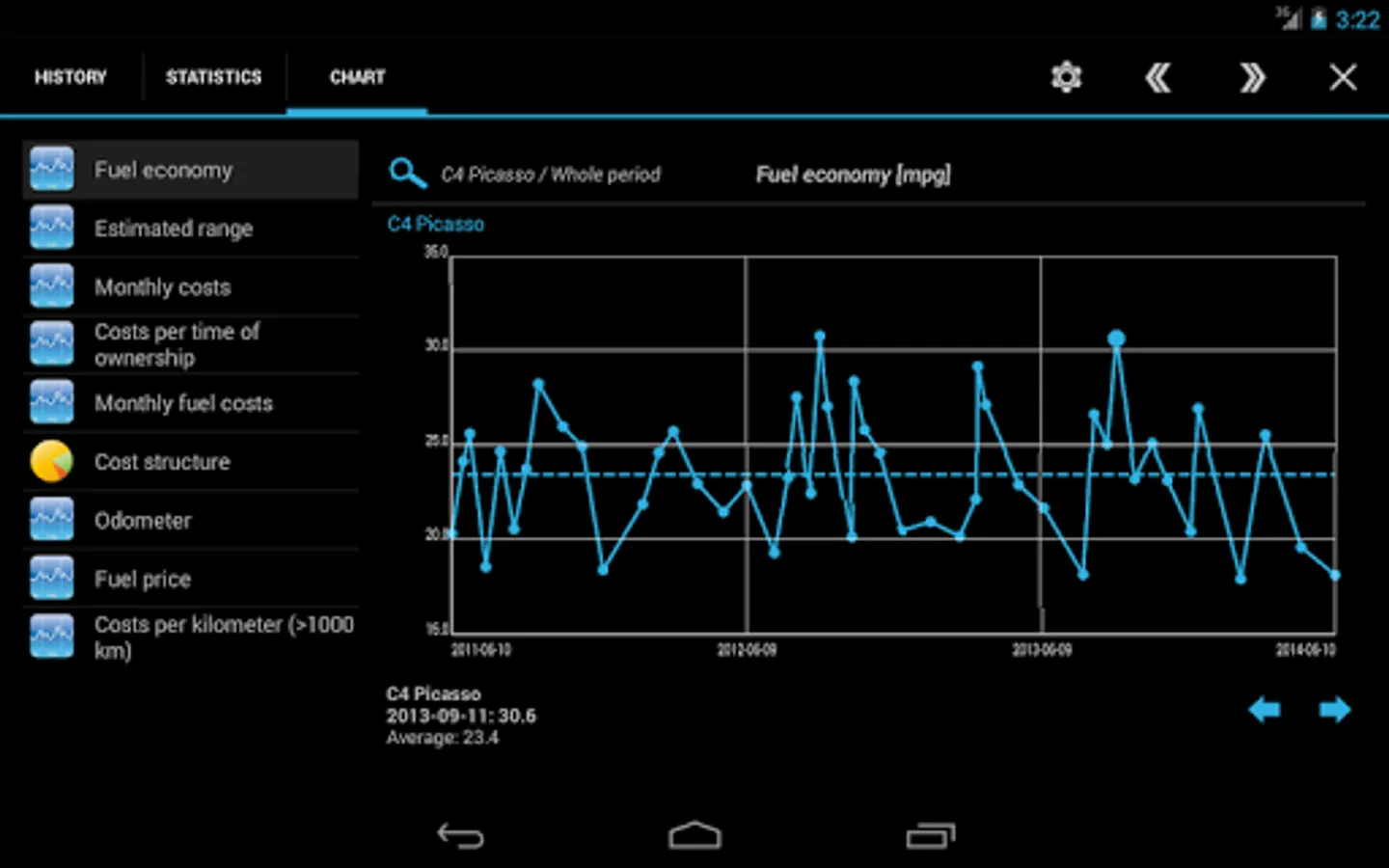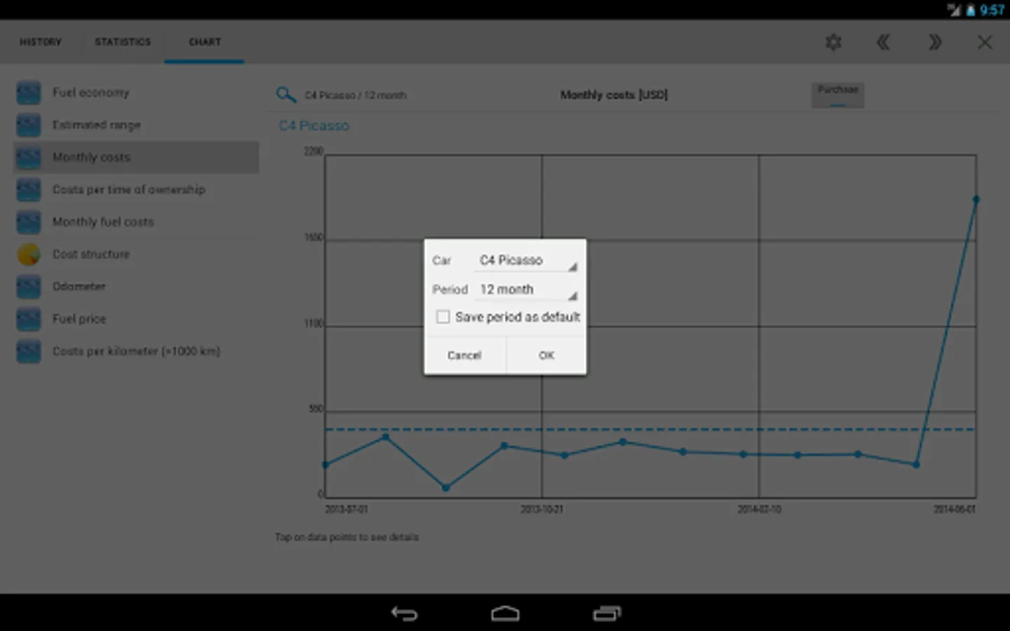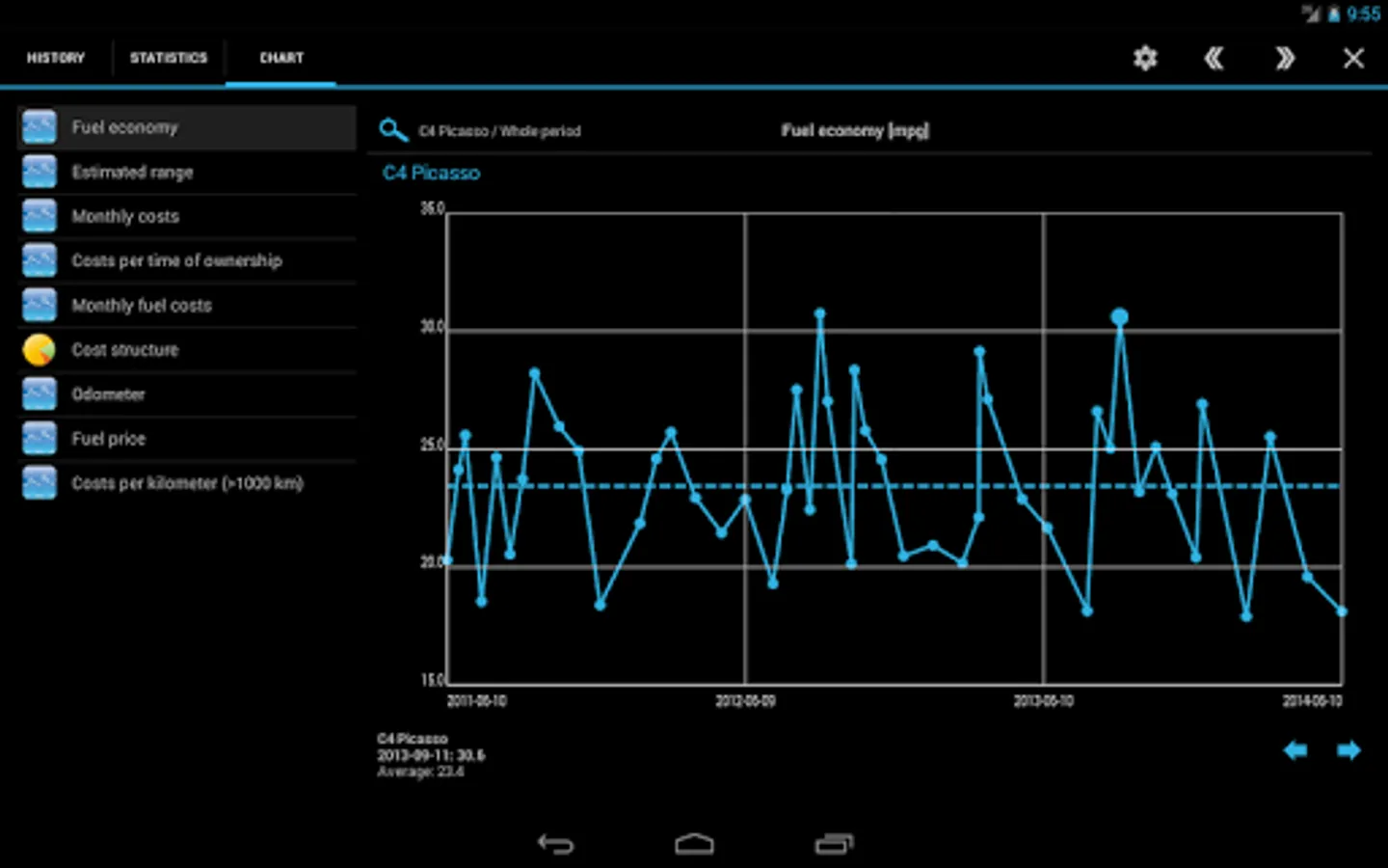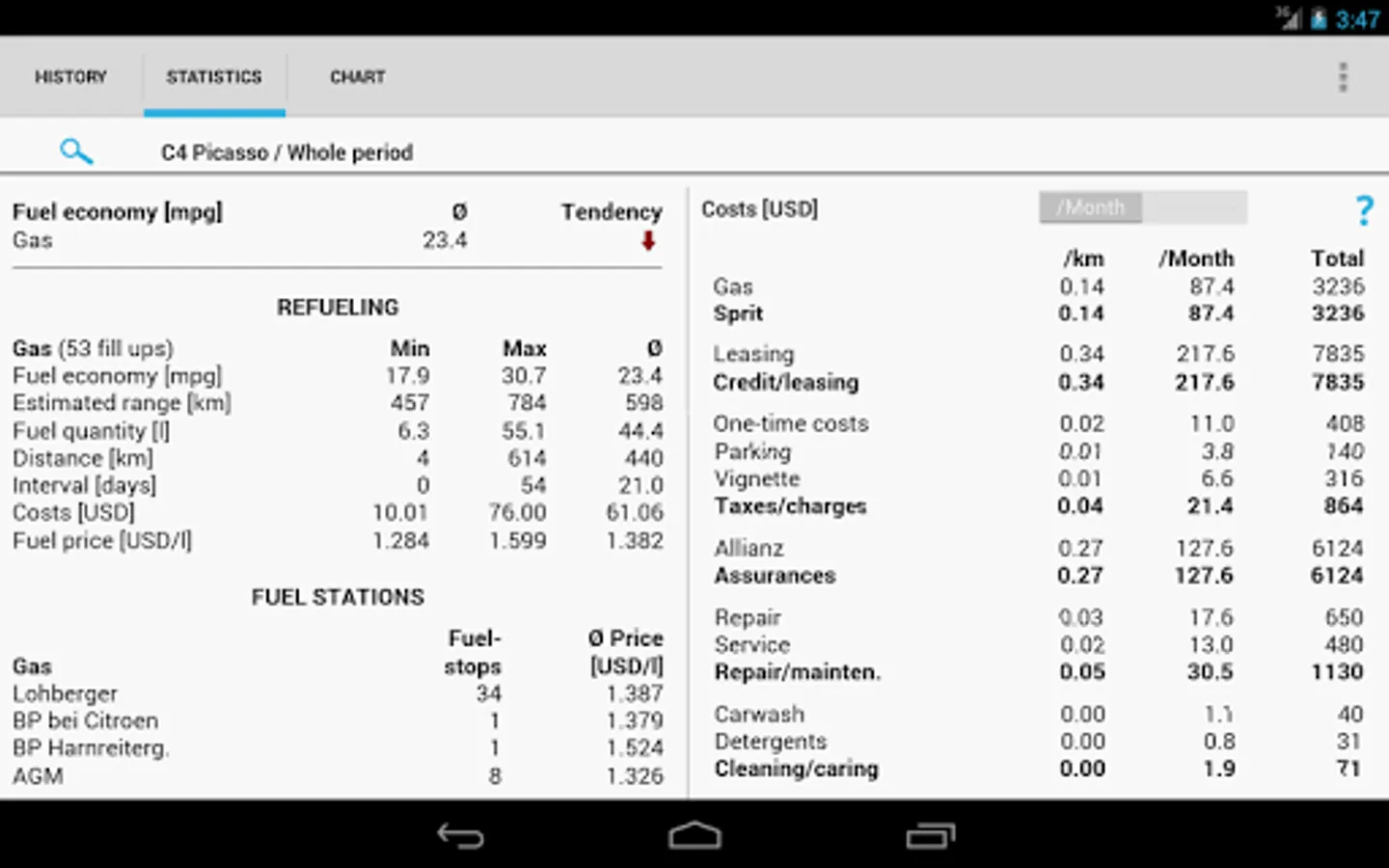✔ 11 interactive charts with touch-sensitive data points: fuel consumption (power consumption), costs, travel distance and more