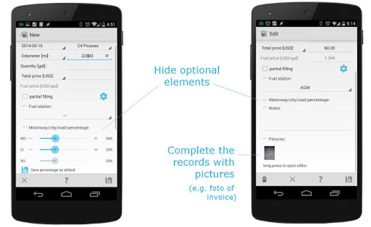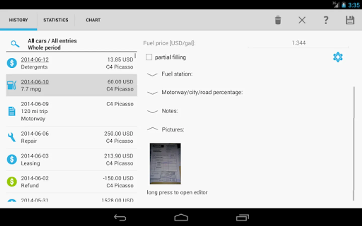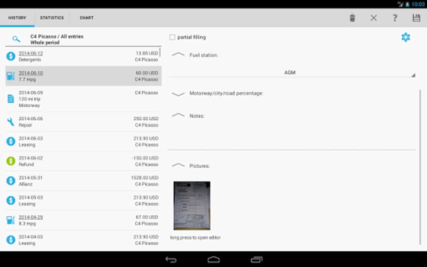 ✔ Easy and flexible recording of refilling, expenses, revenues, repairs and notes