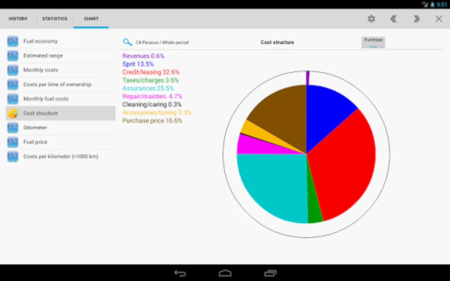 Car Costs Complete provides everything you need for vehicle management: fuel consumption and fuel costs as well as all other car costs