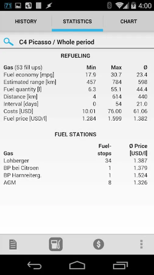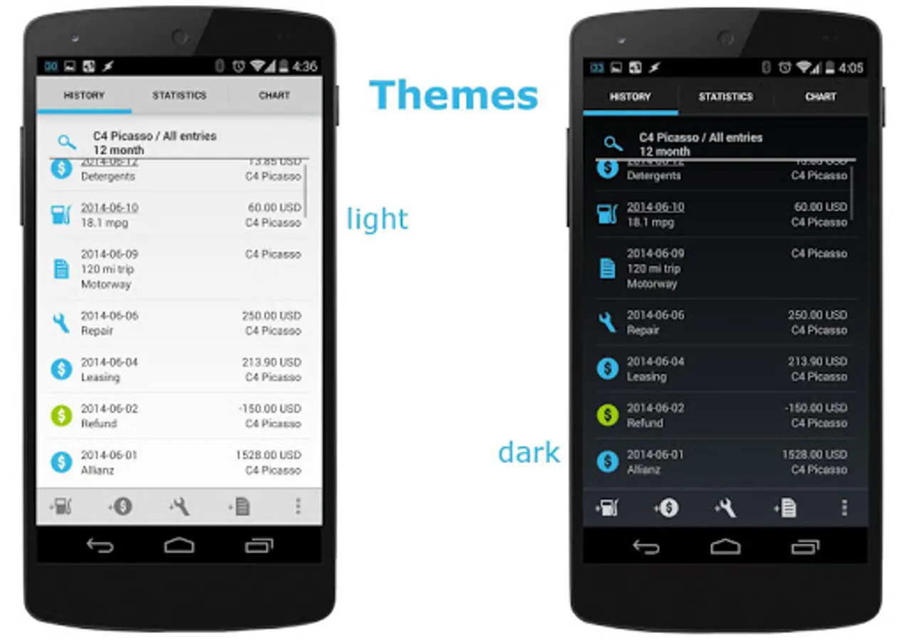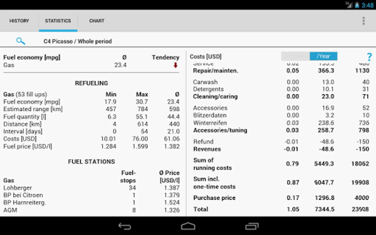 ✔ Extensive, configurable statistics for fuel economy, distance, fuel data and expenses