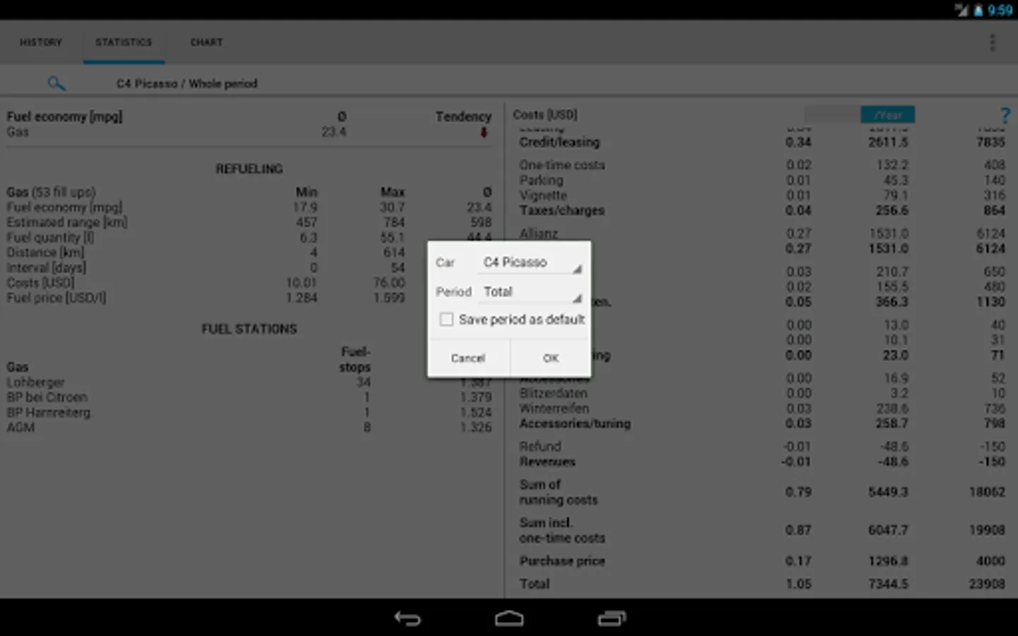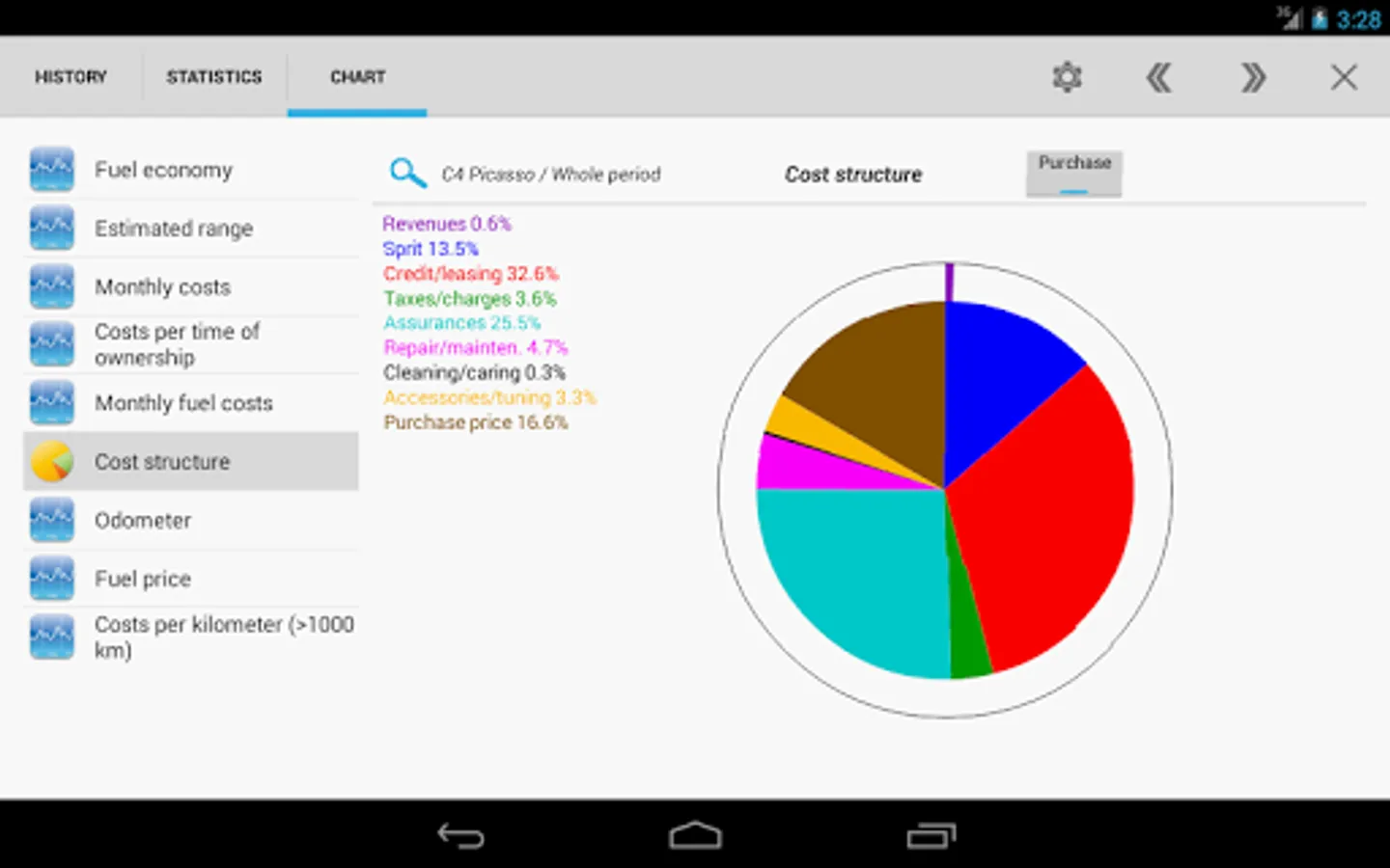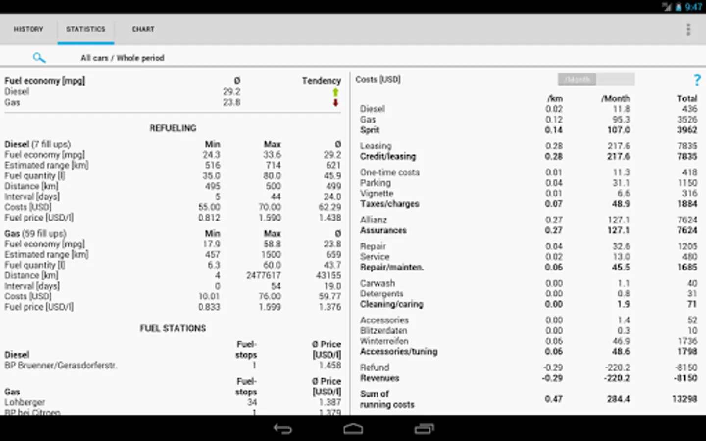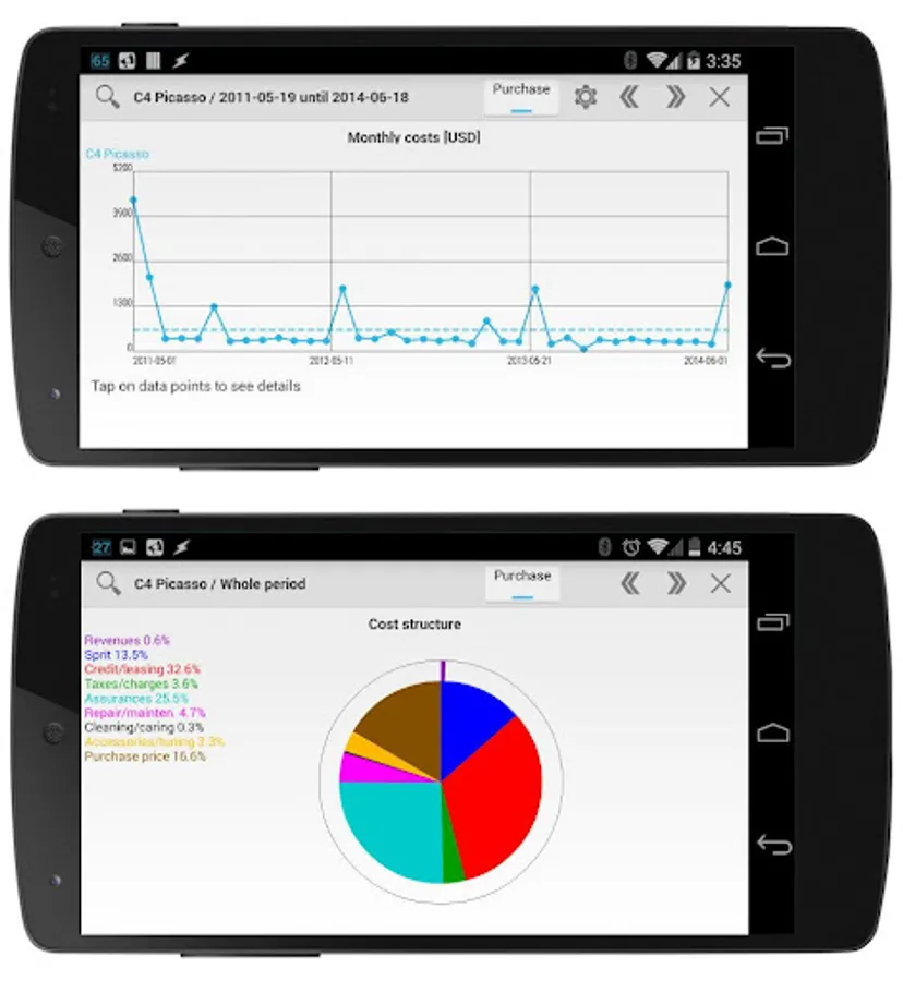 ✔ 11 interactive charts with touch-sensitive data points: fuel consumption, costs, travel distance and more