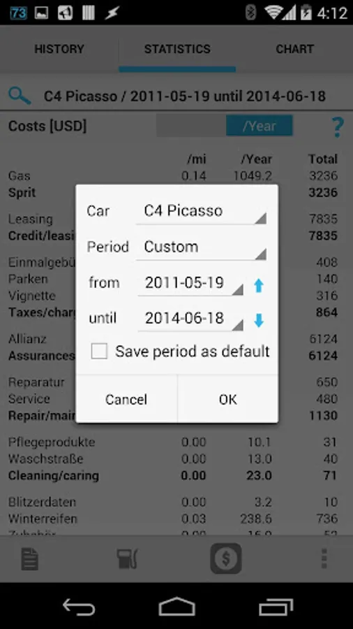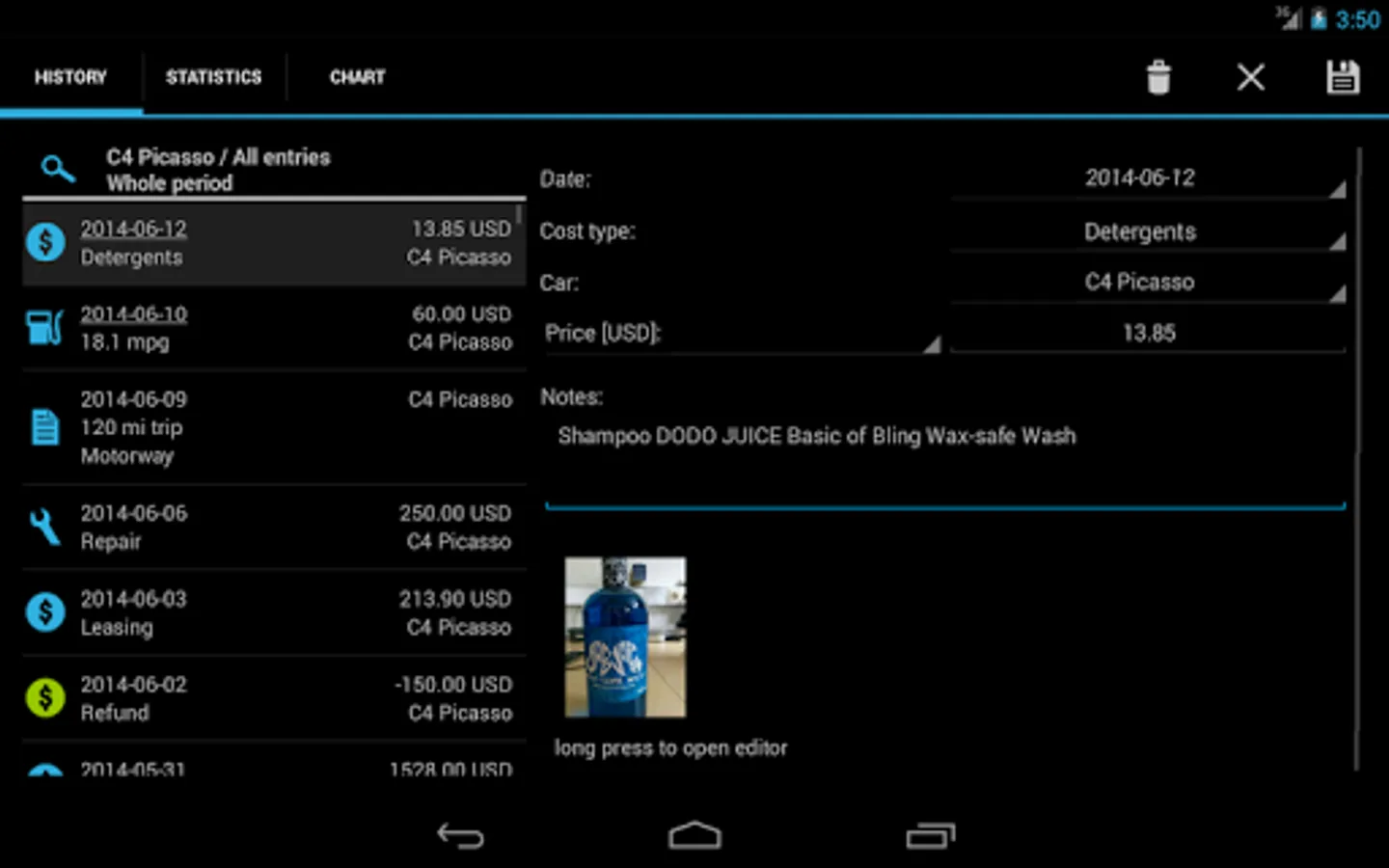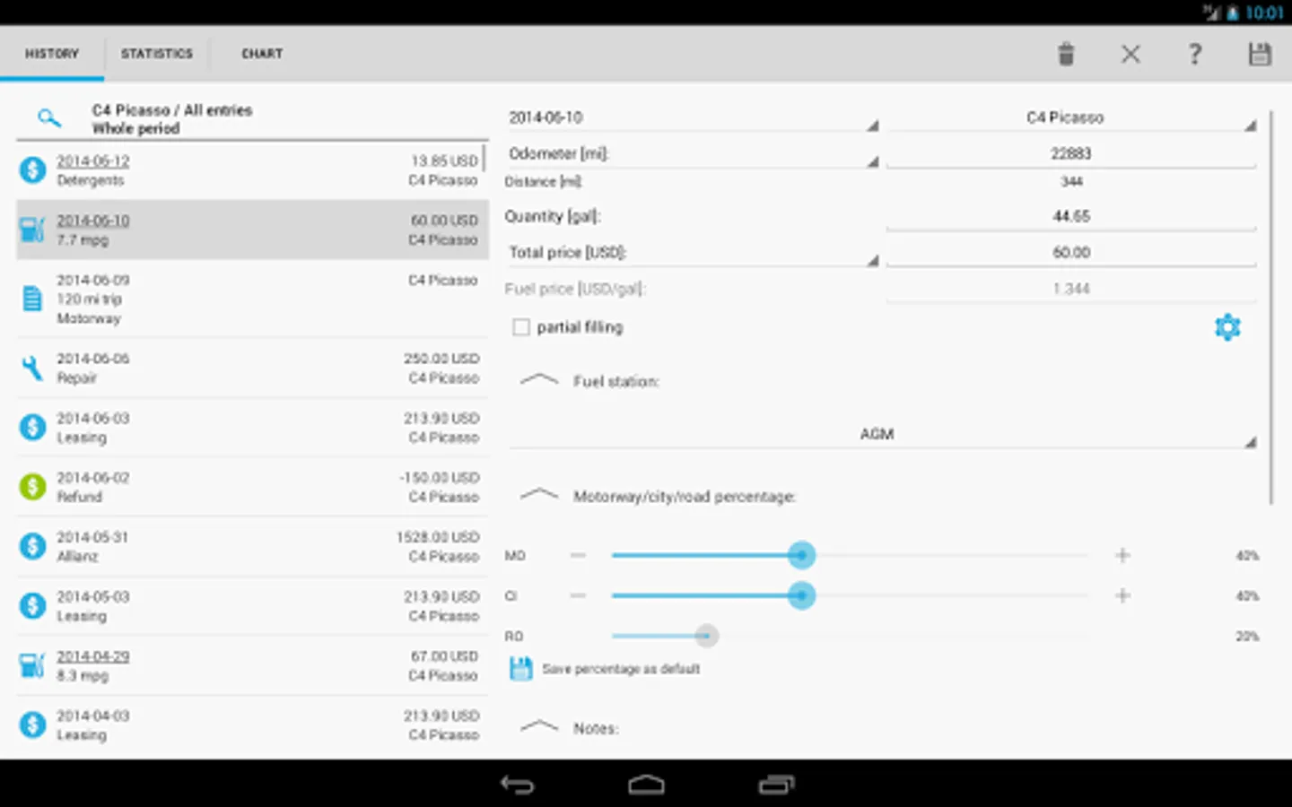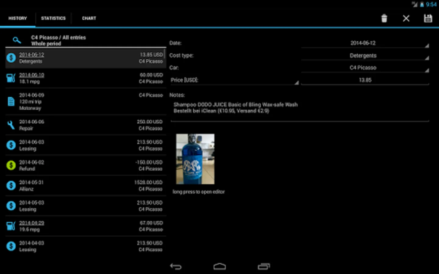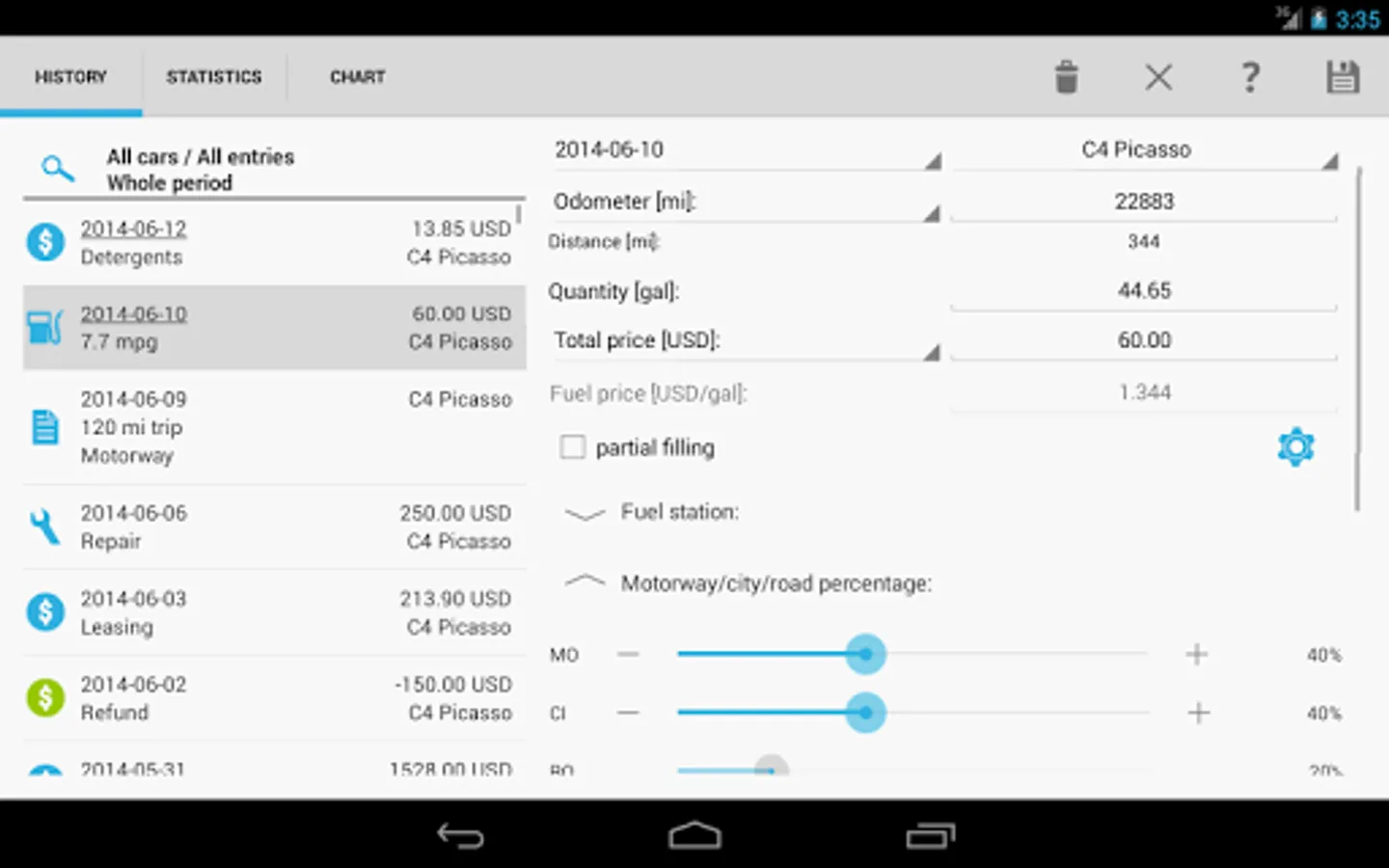 ✔ Easy and flexible recording of refilling, expenses, revenues, repairs and notes