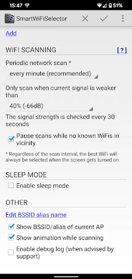 * Sleep mode with own scan intervals to save battery. The sleep mode can either be triggered by time or by the connection to specific WiFi networks. For example, if there are multiple WiFi networks at work, but only a single network at home, you may want to put your home network on the sleep mode list. As soon as you leave your home network, Smart WiFi Selector will enter the normal work mode.