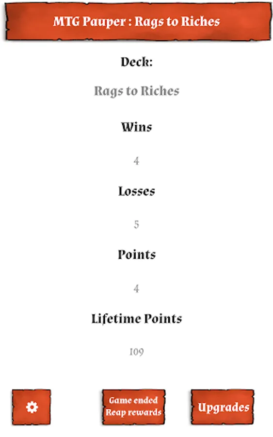 In Pauper you only use commons & an uncommon as your commander. In Rags to Riches, you start with a deck like that, but then you collect points during games and you trade in your points to purchase upgrades to your deck including rares and epics -- but they cost a lot more. This app facilitates tracking your wins, losses, points, & upgrades.