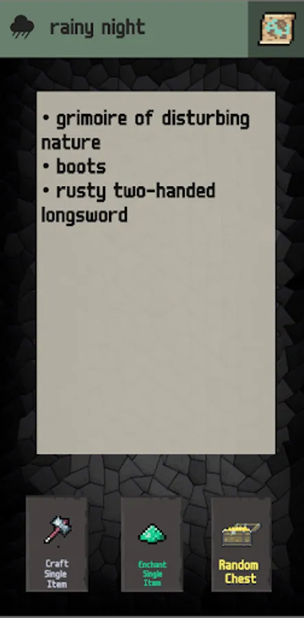 Random Treasure Generator for creating anything from potions to swords. You can use the craft button to create an item and then you may enchant the item to make it even more weird and special. There is also a treasure chest box that randomly generates up to five items at once.