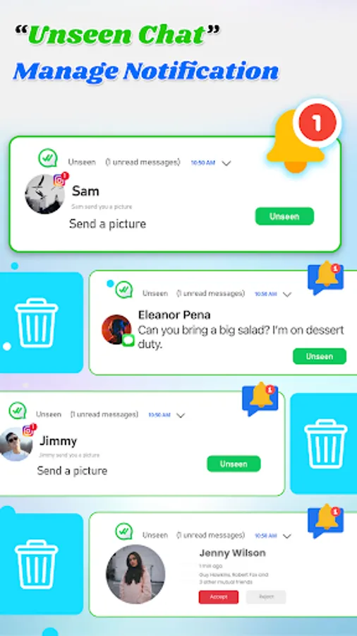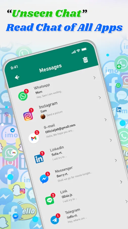 Unseen messenger stores all your unread messages, so you never have to worry about losing important information. And in case a message gets accidentally or intentionally deleted, Unseen Messenger allows you to access your deleted unread messages whenever you need them.
