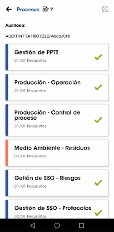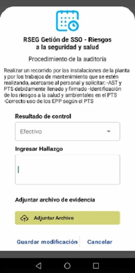 SIGTASA application – Internal Audit, allows executing the different audit processes. In the application it will be possible to select the Result of the Control, Finding and attach evidence files.
