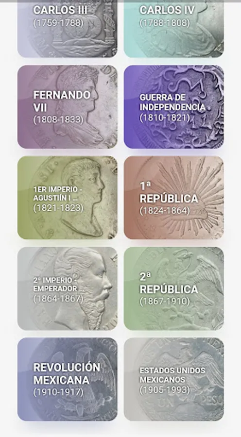 In Mexico you find (historical monetary scheme): Carlos III (1759-1788), Carlos IV (1788-1808), Fernando VII (1808-1833), War of Independence (1810-1821), 1st Empire Agustin Iturbide (1821-1823 ), 1st Republic (1824-1864), 2nd Emperor Maxilian Empire (1864-1867), 2nd Republic (1867-1910), Mexican Revolution (1910-1917), United Mexican States (1905-1993). It includes different monetary systems, real, shields, pesos, cents...