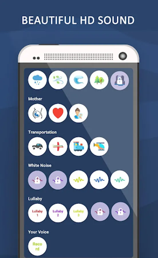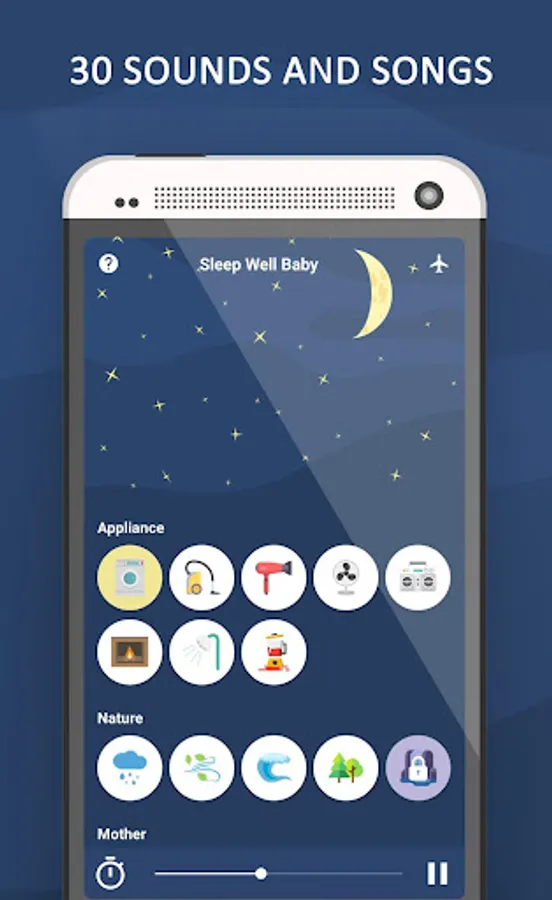 SleepWellBaby contains great selection of soothing white noise and lullabies. It has a simple timer that saves your battery. In addition to that it contains sounds recorded by parents. All sounds are available offline so you do not need the internet.