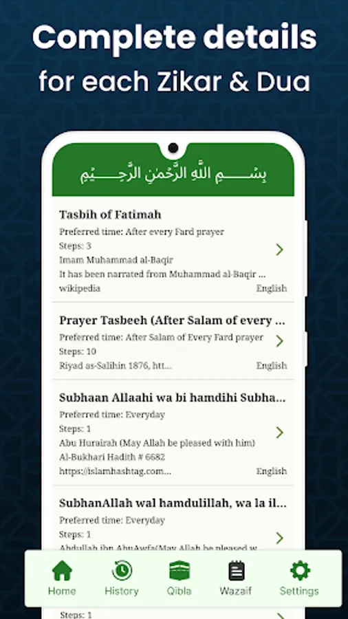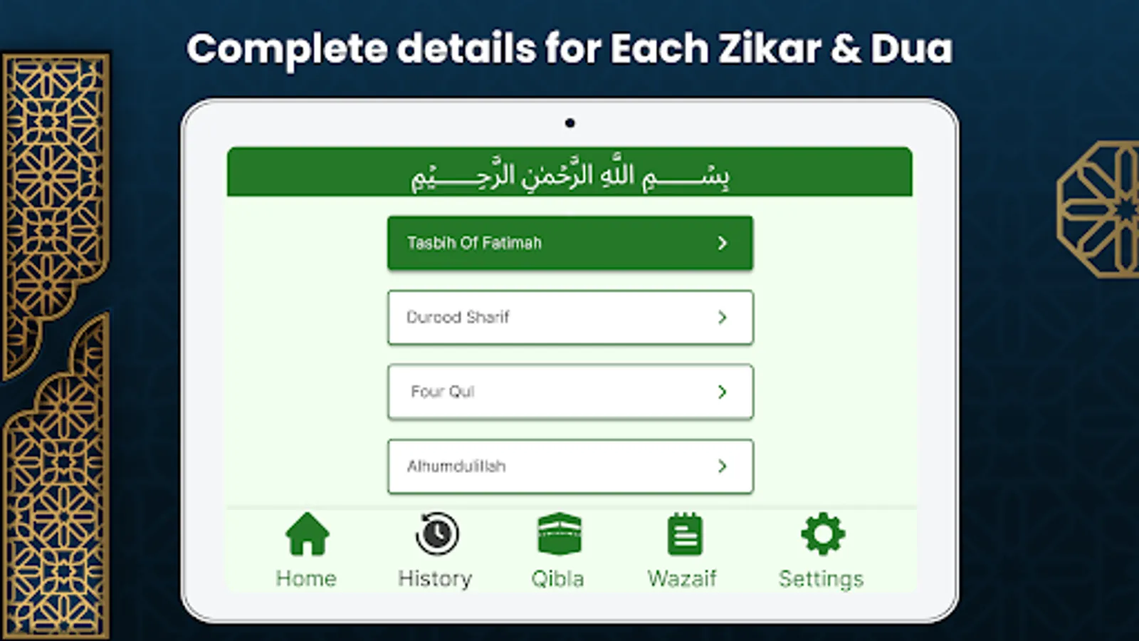 (تسبیحةالزھراء / تسبیح فاطمہ الزھرا). For each step (thasbeeh) in a wazifa (tesbih sequence), It shows text to recite and repetitions to make thus making complex tasbeeh sequences simple.