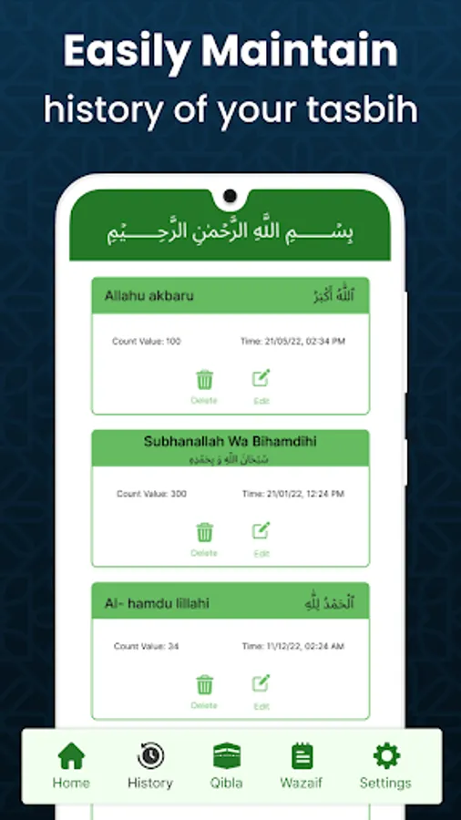 • If you leave your tasbeeh incomplete, the app will help you continue where you left off.