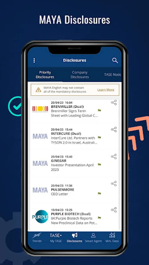 All disclosures published by TASE companies and mutual fund managers, such as immediate reports, financial statements, capital raising information, changes in the board of directors and management, splits and mergers and other ongoing disclosures.