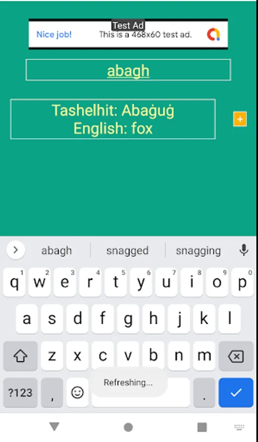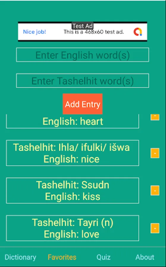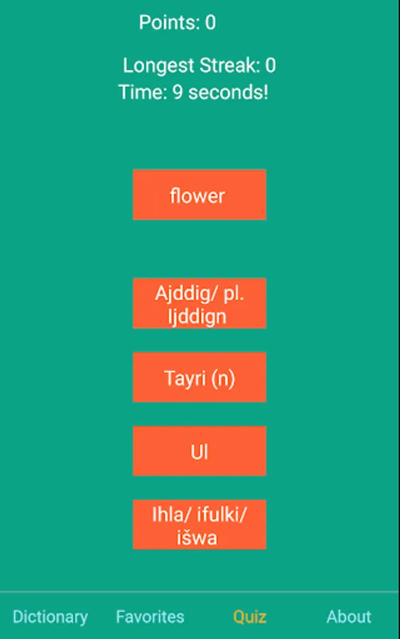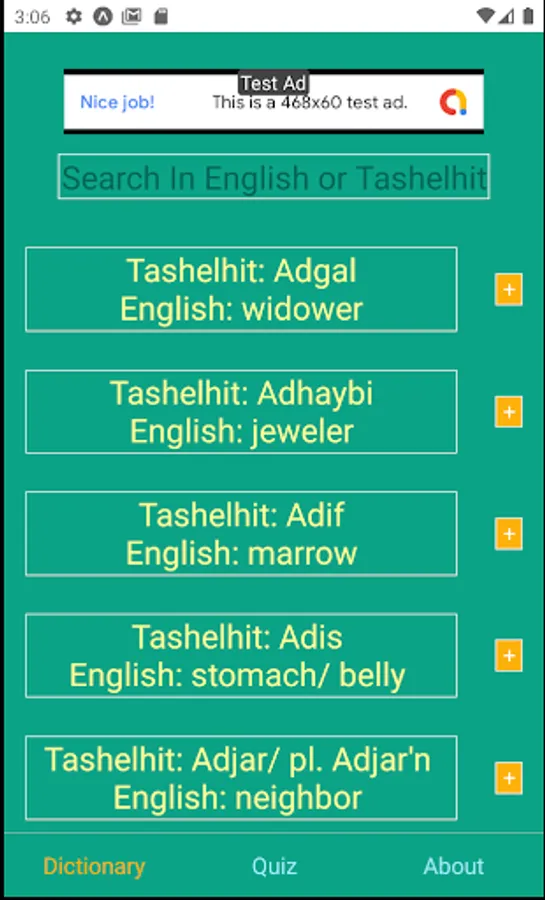 Use this Tashelhit (AKA Tashel7it, Tachelhit, Shelha, Chleuh) dictionary to look up words in either language. The dictionary contains about 30,000 entries. While the Tashelhit words are displayed using diacritics for some sounds, you can still search using sh or ch, gh, x or kh, 7 or h, q or 9, etc. You can "favorite" words you come across in the dictionary and quiz yourself on them, or just quiz yourself on random words. You can also add your own custom entries to your favorites list.