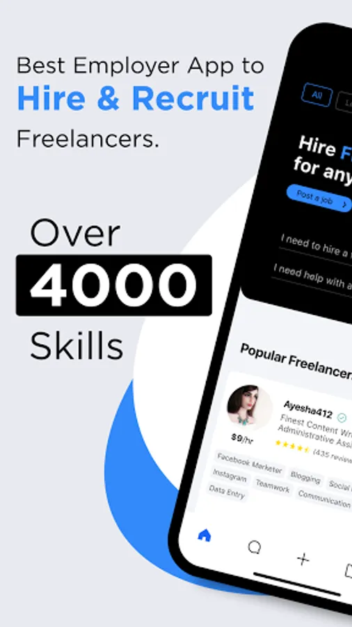 Instead of investing hours searching for the right talent, explore the entire pool of over 90,000 freelancers at our app and then hire the one that suits your requirement right from your mobile. Our worldwide network of freelancers possesses expertise in more than 4000 skills across 400+ categories of work.