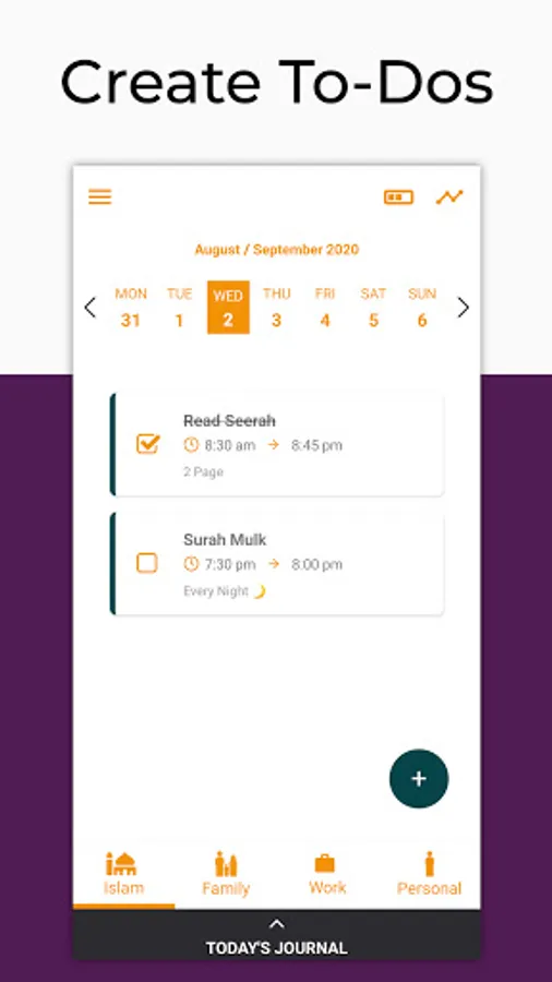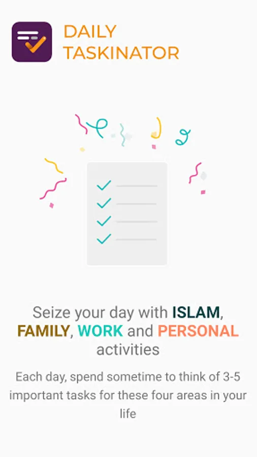 This app is pretty straight-forward. It is a TODO app. However, it makes you lead a balanced life every day. Arrange your daily routine with Islam, Family, Work and Personal tasks in this app. Once you have a combination of these 4 areas in your life you will be able to lead a much more fulfilling and productive life in shaa Allah.
