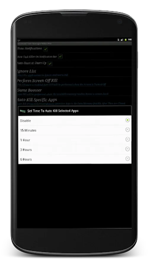 Auto Kill: Some time when you close some apps they keep on running at the background. Select those frequently used apps and Advanced Task Manager will automatically kill them after a specific time selected by you.