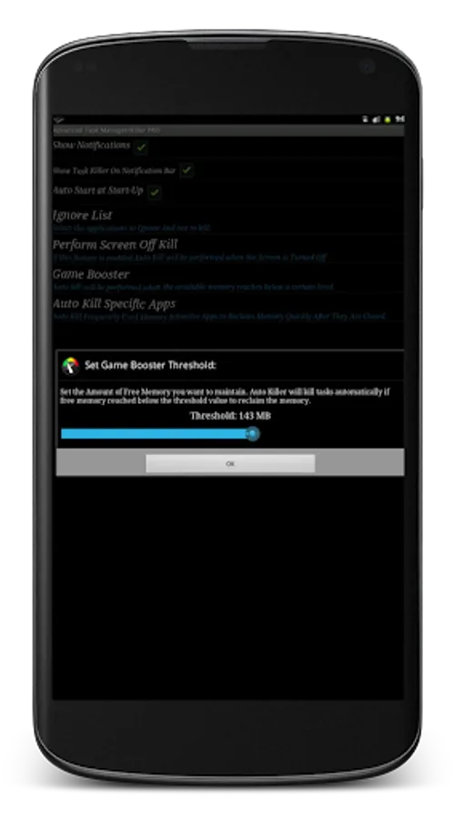 Game Booster: Boost your game performance by killing other background processes when your game is running. Select the amount of free memory you want to maintain and then select the game to boost the performance. Advanced task killer will maintain this free memory for you by killing other background tasks.