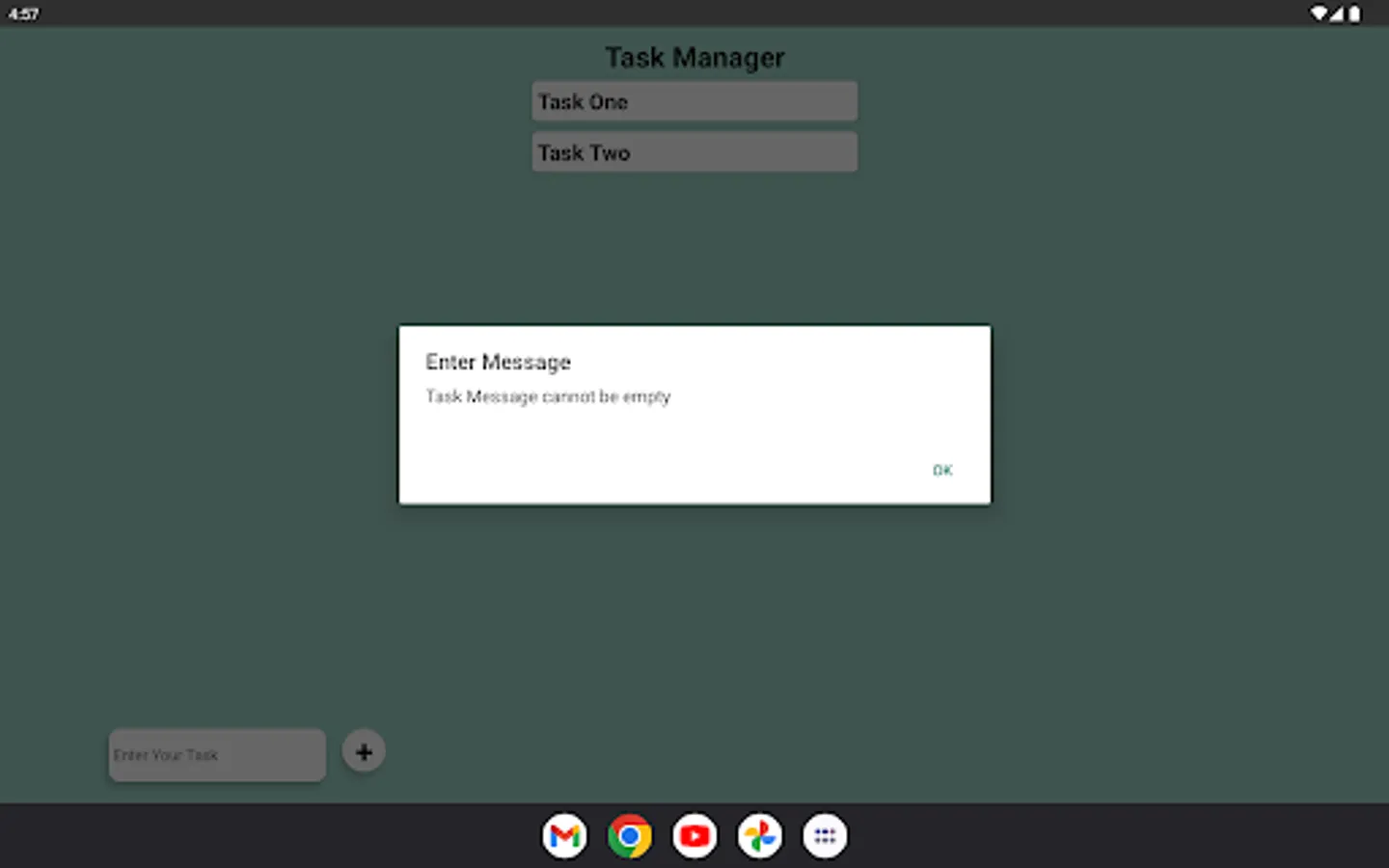 Task Manager which manages your daily task while you can keep the things in the task manager and it will alter when the time comes . As in the early stages we are developing the Application we are using local storage of your app for performing the daily task Alert .